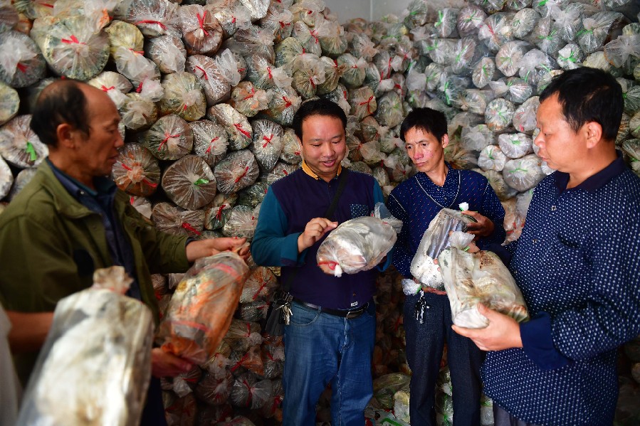 Yang Jue (front), a poverty alleviation official who has been assigned as the Party chief to Shangli Village, visits an edible fungi plant in Rongshui Miao Autonomous County of Liuzhou, south China's Guangxi Zhuang Autonomous Region, Feb. 28, 2019. (Xinhua/Huang Xiaobang)