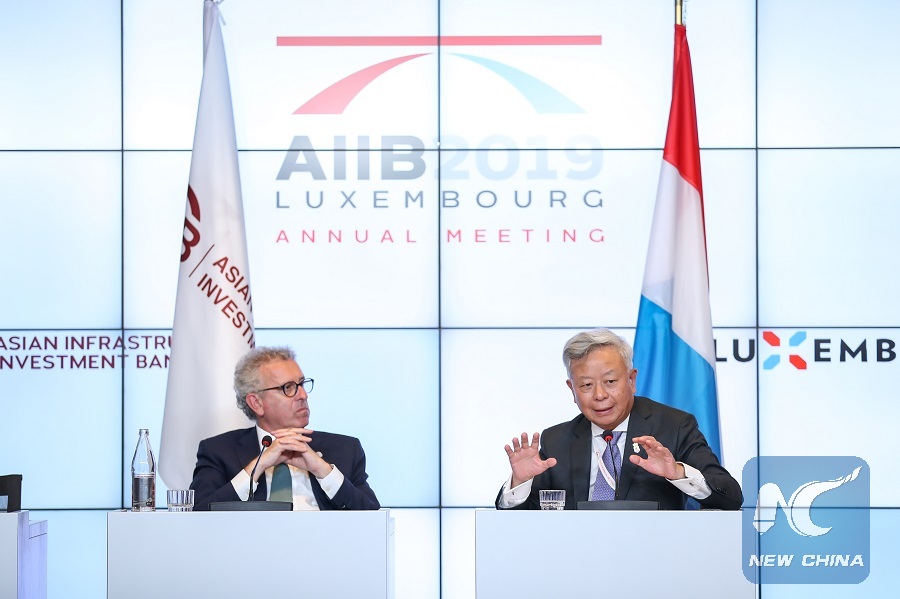 Jin Liqun (R), president of Asian Infrastructure Investment Bank (AIIB), and Pierre Gramegna, minister of finance of Luxembourg, attend a joint press conference during the fourth annual meeting of the AIIB in Luxembourg, July 12, 2019. (Xinhua/Zhang Cheng)