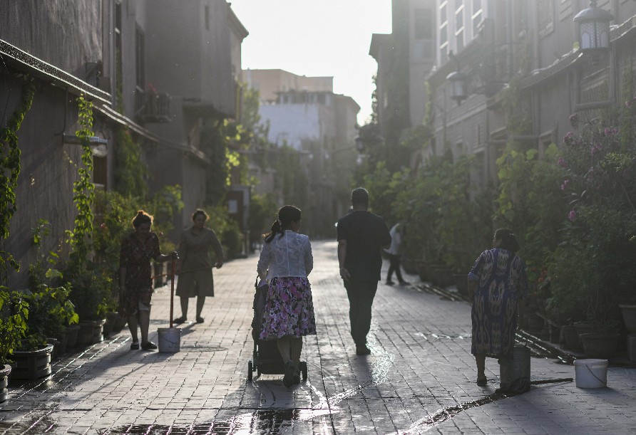 People stroll on the street in the morning at the ancient city of Kashgar, northwest China's Xinjiang Uygur Autonomous Region, July 9, 2019. (Xinhua/Zhao Ge)