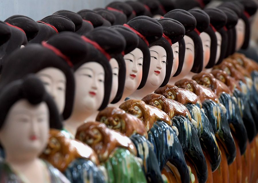 Tri-colored glazed potteries are seen at a workshop in Nanshishan Village of Mengjin County in Luoyang City, central China's Henan Province, July 23, 2019. Sancai, or tri-colored glazed pottery, is made of white clay and coated with a layer of glaze. The producing technique of Sancai, which prevailed in the Tang Dynasty (618-907 AD), was very complex and listed as one of China's National Intangible Heritages in 2008. (Xinhua/Li An)