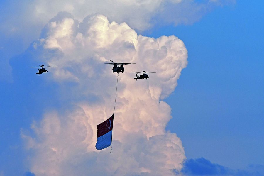 A helicopter of the Republic of Singapore Air Force tows a national flag during the National Day parade rehearsal in Singapore July 27, 2019. (Xinhua/Then Chih Wey)