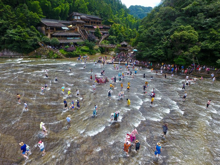 People cool themselves in shallow water at the Baishuiyang scenic spot in Pingnan County, southeast China's Fujian Province, July 26, 2019. (Xinhua/Jiang Kehong)