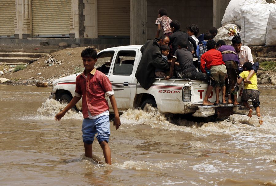 A car runs in floodwater after heavy rain in Sanaa, Yemen, July 26, 2019. Heavy rains and flood frequently hit many governorates in Yemen this summer. (Photo by Mohammed Mohammed/Xinhua)