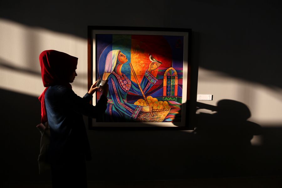 A visitor takes photos of a painting by Palestinian artist during an exhibition in Gaza City, July 27, 2019. About 64 artists presented their works at the art exhibition. (Str/Xinhua)