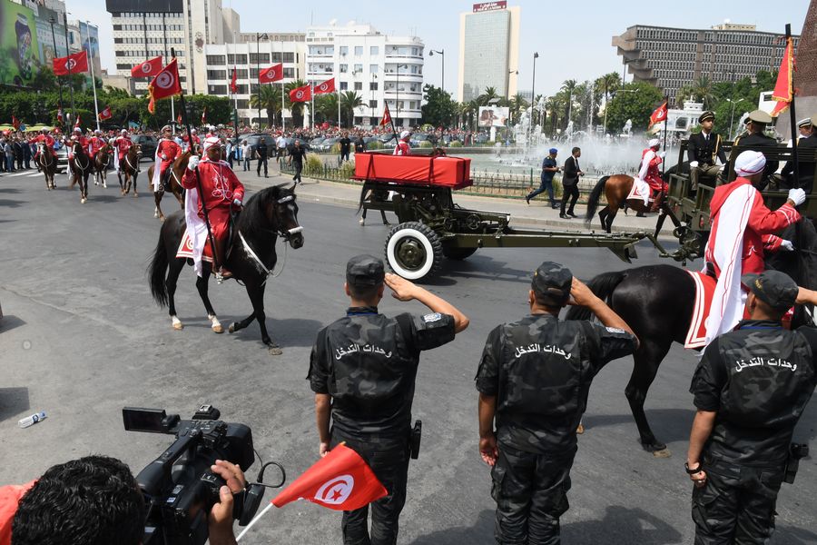 Photo taken on July 27, 2019 shows the military procession accompanying the coffin of late Tunisian President Beji Caid Essebsi during his state funeral in Tunis, Tunisia. Tunisian people paid on Saturday their last tribute to late President Beji Caid Essebsi, who passed away Thursday morning at the age of 92. (Photo by Adele Ezzine/Xinhua)
