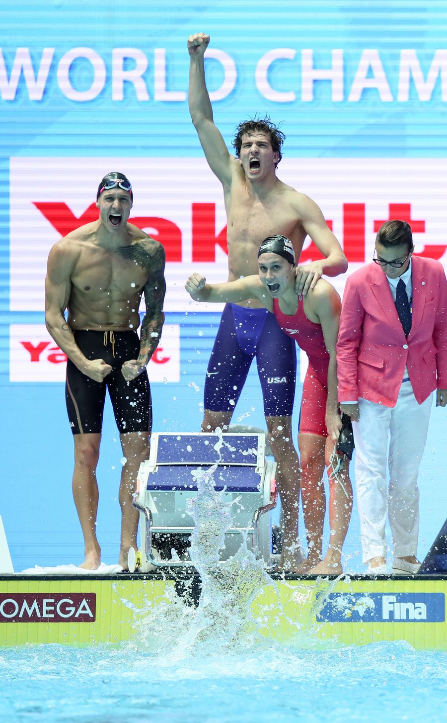 Swimmers of the United States celebrate after the mixed 4x100m freestyle relay final at FINA World Championships in Gwangju, South Korea, on July 27, 2019. Team of the United States set a new world record with 3 minutes 19.40 seconds. (Xinhua/Bai Xuefei)