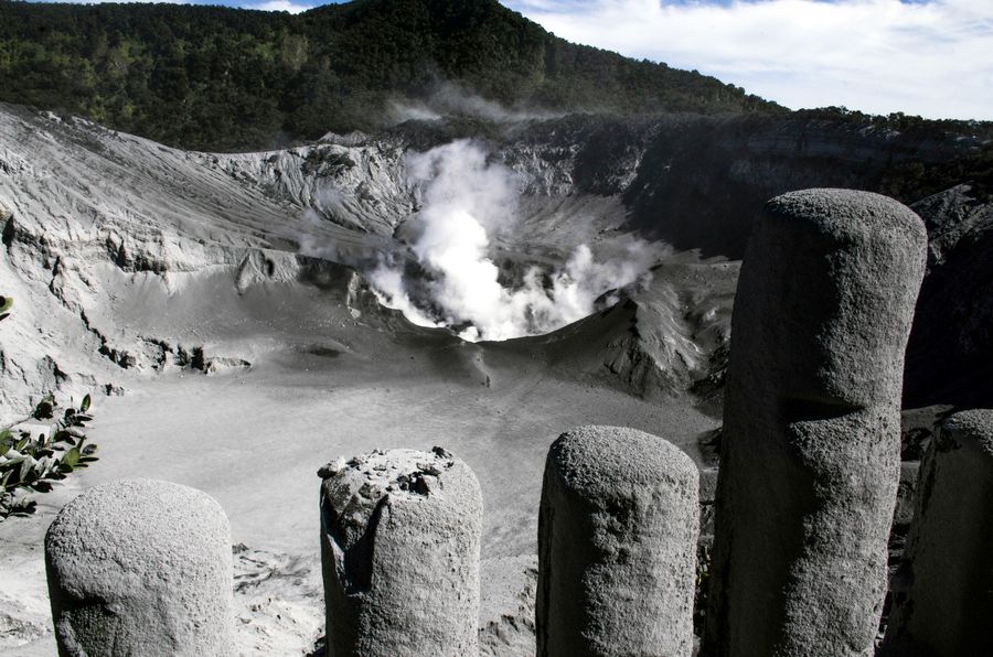 Smoke spews from the crater of Mount Tangkuban Parahu in Subang of West Java, Indonesia, July 27, 2019. (Photo by Syarif/Xinhua)