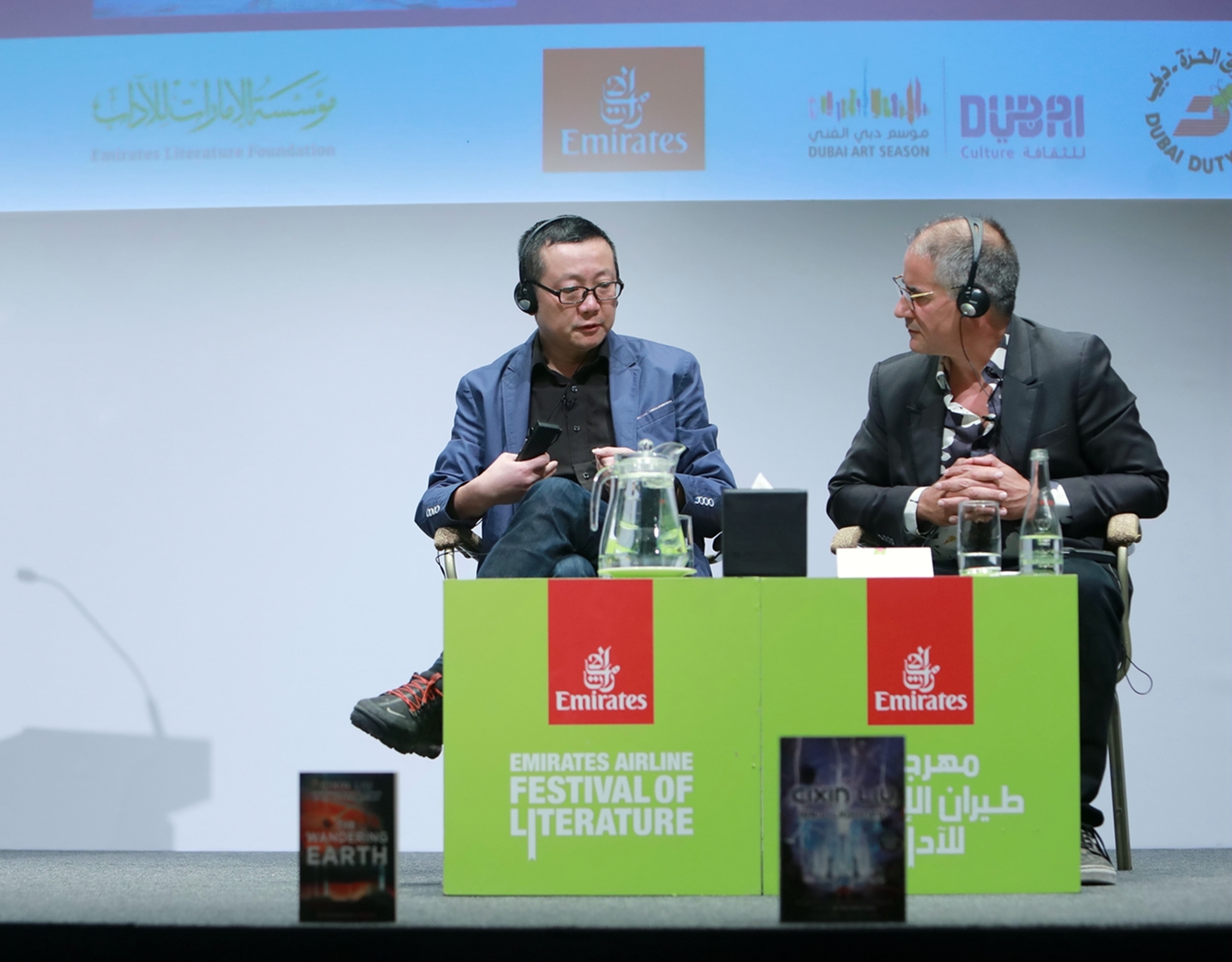 Chinese sci-fi writer Liu Cixin (L) speaks during a meeting with his readers at the Emirates Airline Festival of Literature in Dubai, the United Arab Emirates (UAE), on March 8, 2019. (Xinhua)