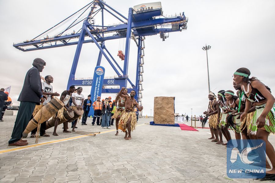 Local people perform during the inauguration ceremony of the new container terminal in Walvis Bay, Namibia, Aug. 2, 2019. (Xinhua/Zhang Yu)