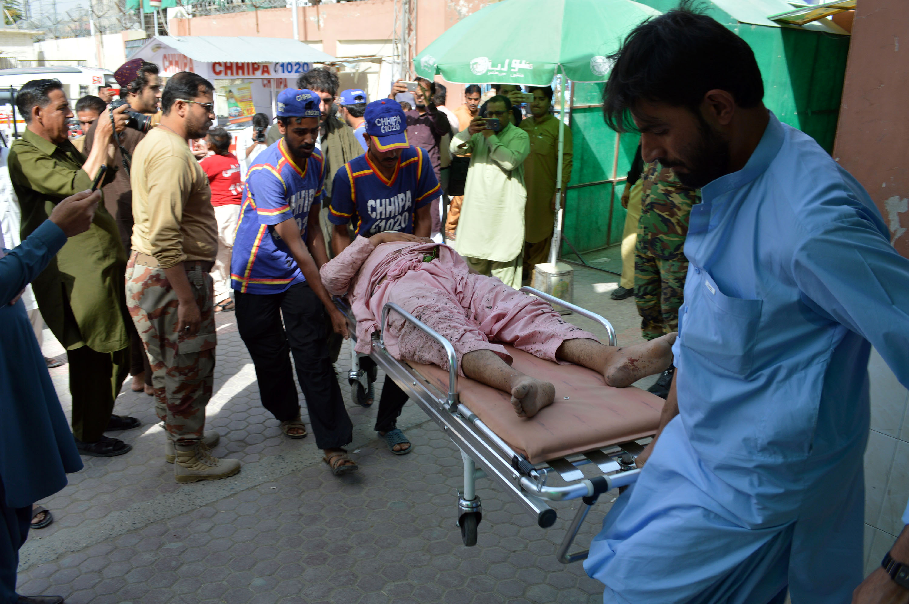 People transfer an injured man to hospital following a blast in southern Pakistan's Quetta on Aug. 16, 2019. A blast hit a mosque in Pakistan's southwest Quetta district on Friday afternoon, killing five people and leaving 15 others injured, police said. (Photo by Irfan/Xinhua)