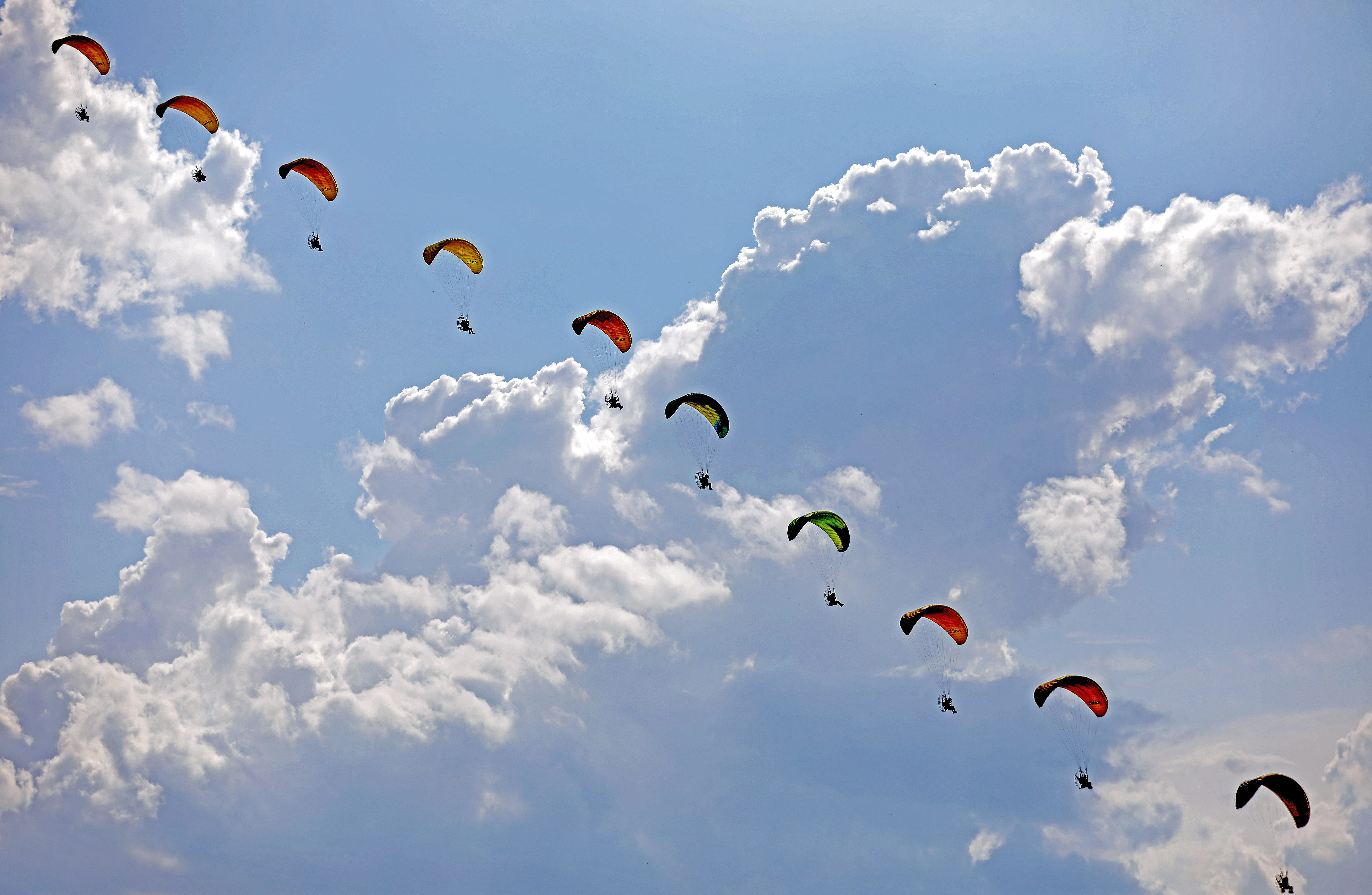 Photo taken on Aug. 16, 2019 shows paramotor performance during the 8th Faku Flight International Conference in Shenyang, capital of northeast China's Liaoning Province. (Xinhua/Yao Jianfeng)