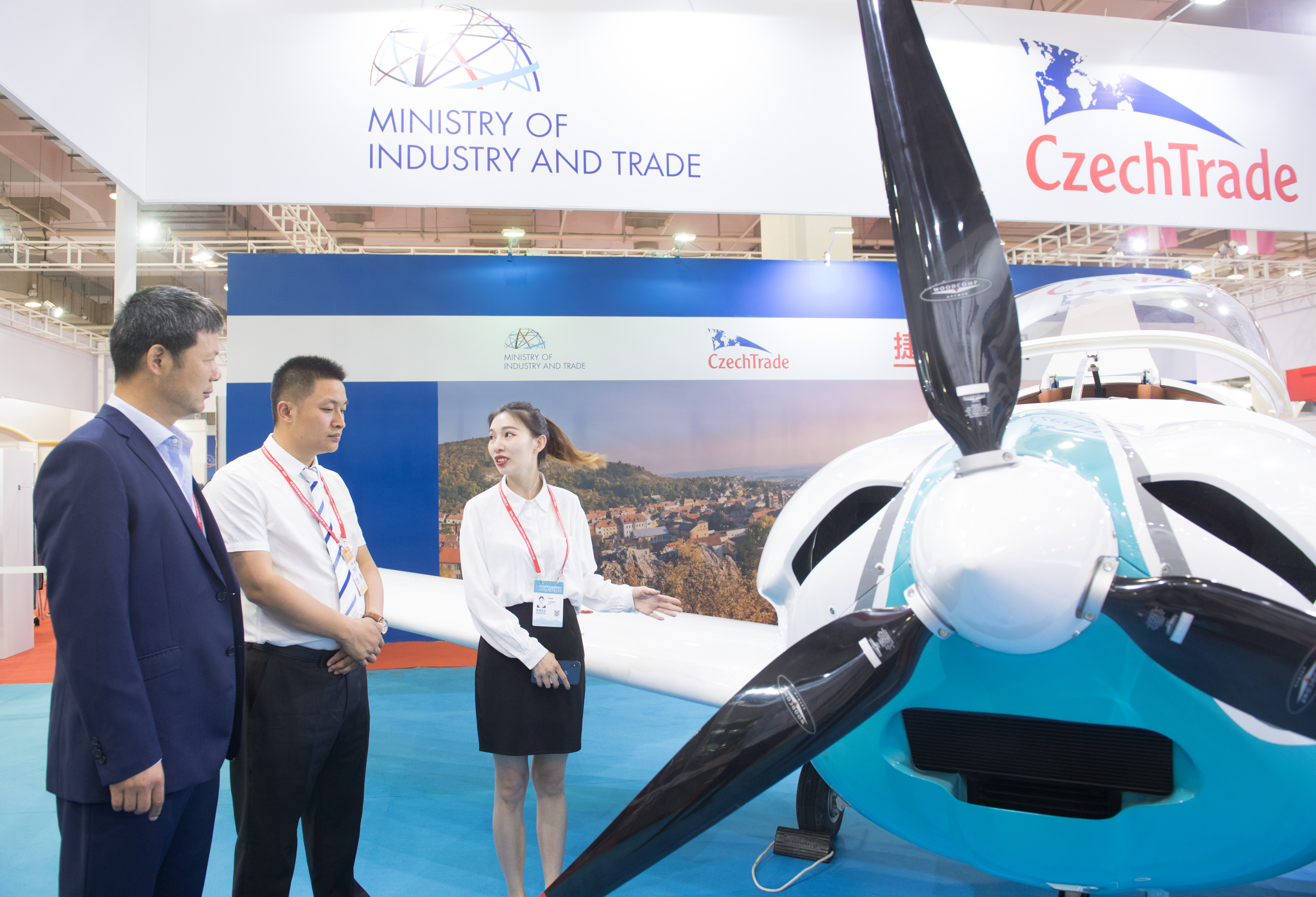 An exhibitor introduces an airplane made in the Czech Republic on the first China-Central and Eastern European Countries Expo in Ningbo, east China's Zhejiang Province, June 8, 2019. (Xinhua/Weng Xinyang)