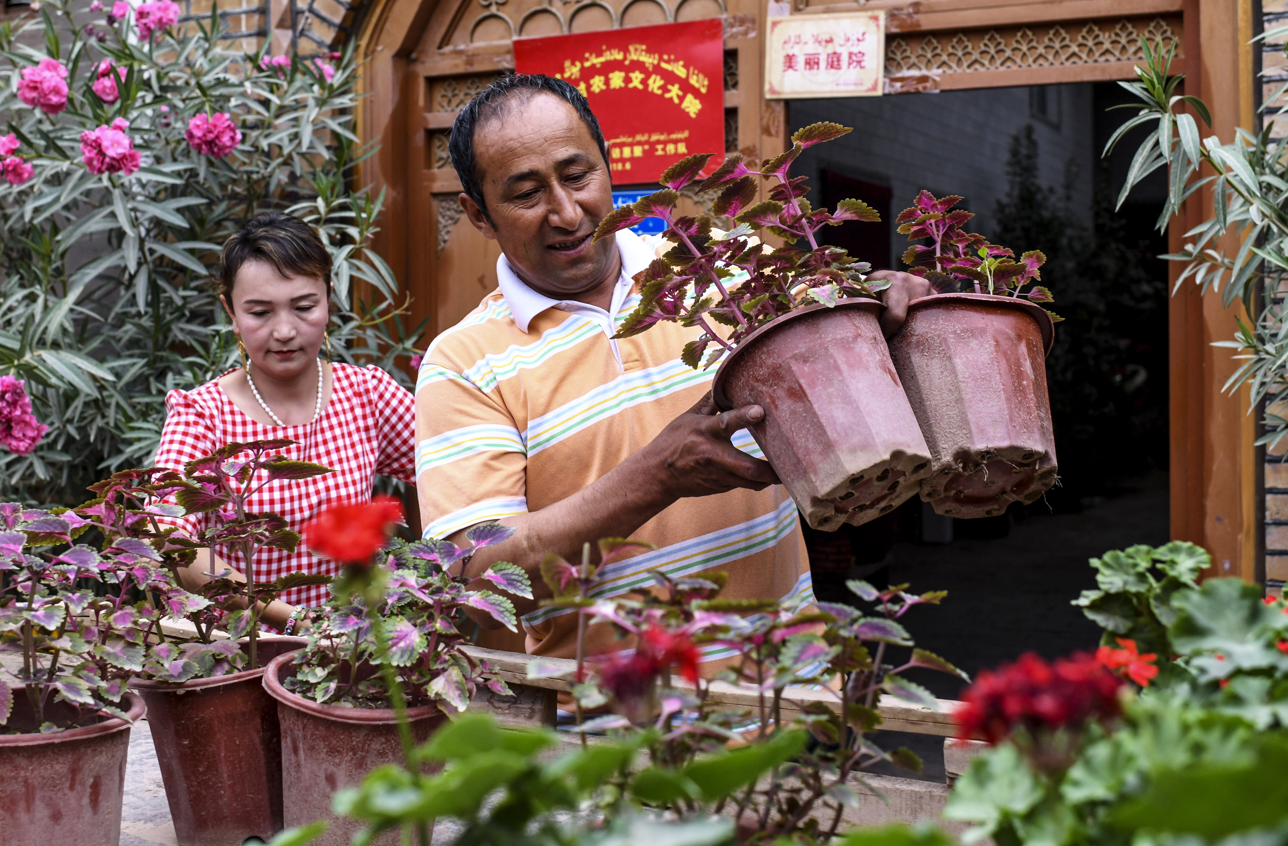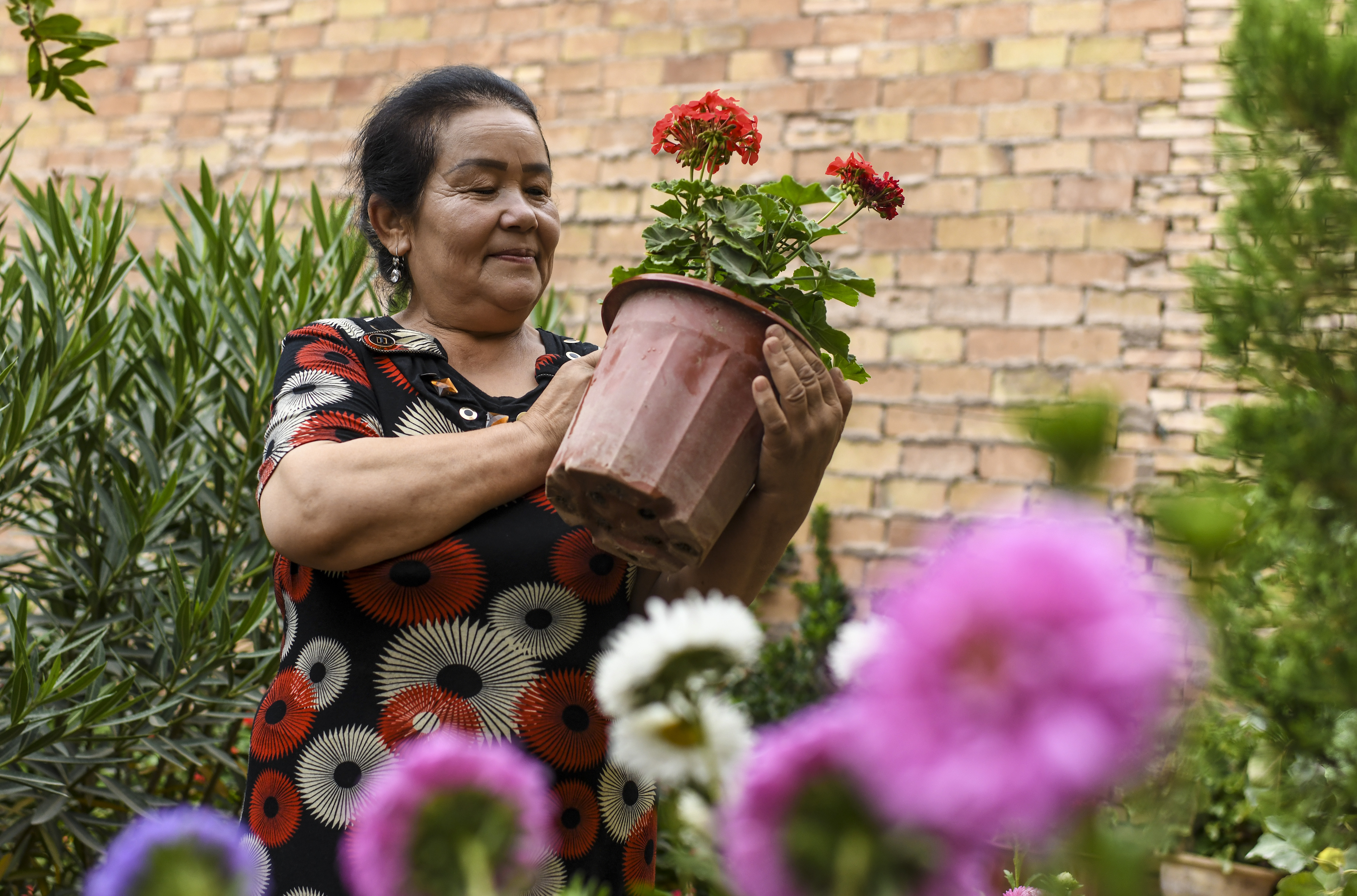 Salima Sultan checks the growth of flowers at home in Qianjin Village in Kashgar, northwest China's Xinjiang Uygur Autonomous Region, Aug. 18, 2019. (Xinhua/Wang Fei)
