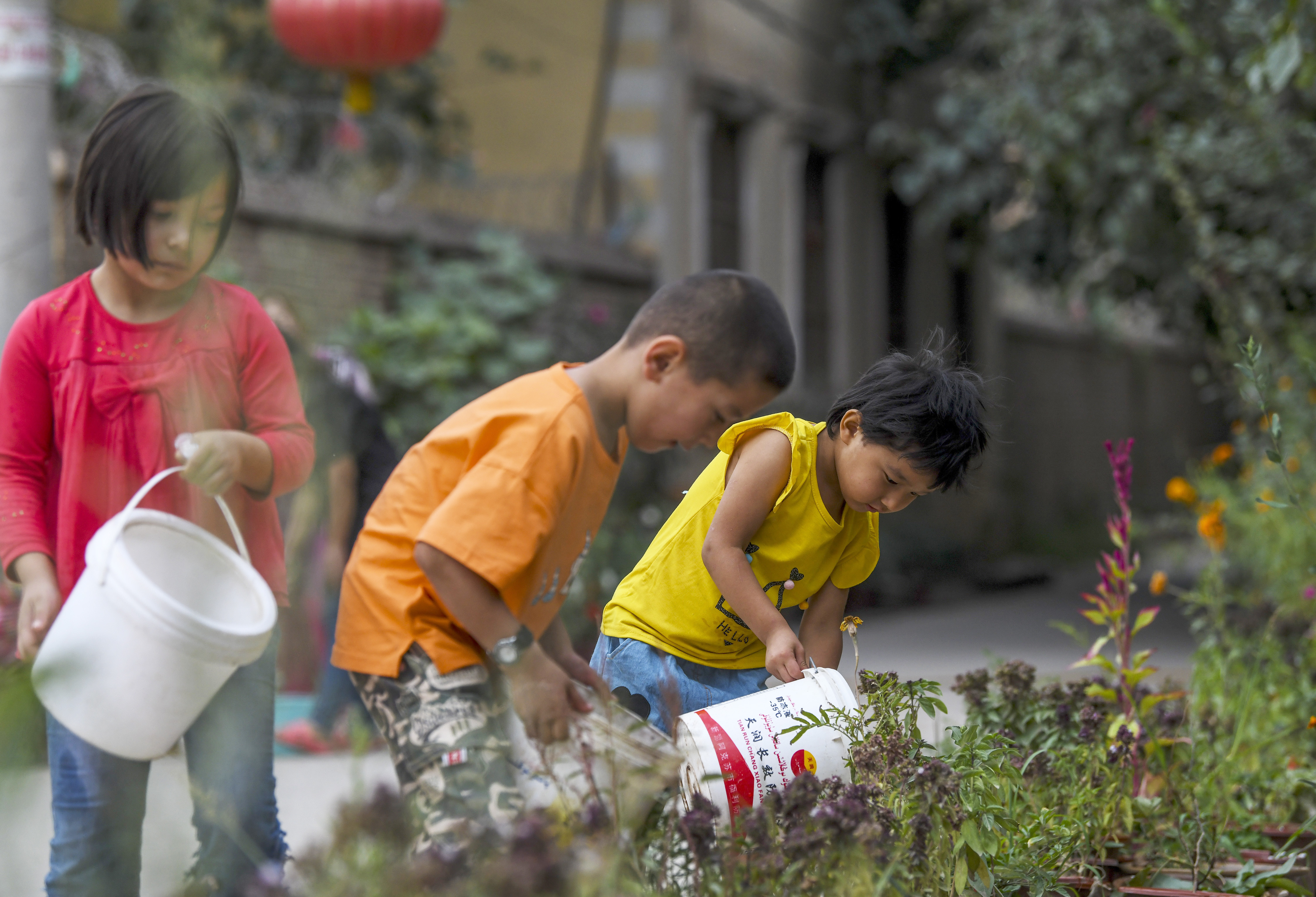 Children water flowers in an alley at Qianjin Village in Kashgar, northwest China's Xinjiang Uygur Autonomous Region, Aug. 18, 2019. (Xinhua/Wang Fei)