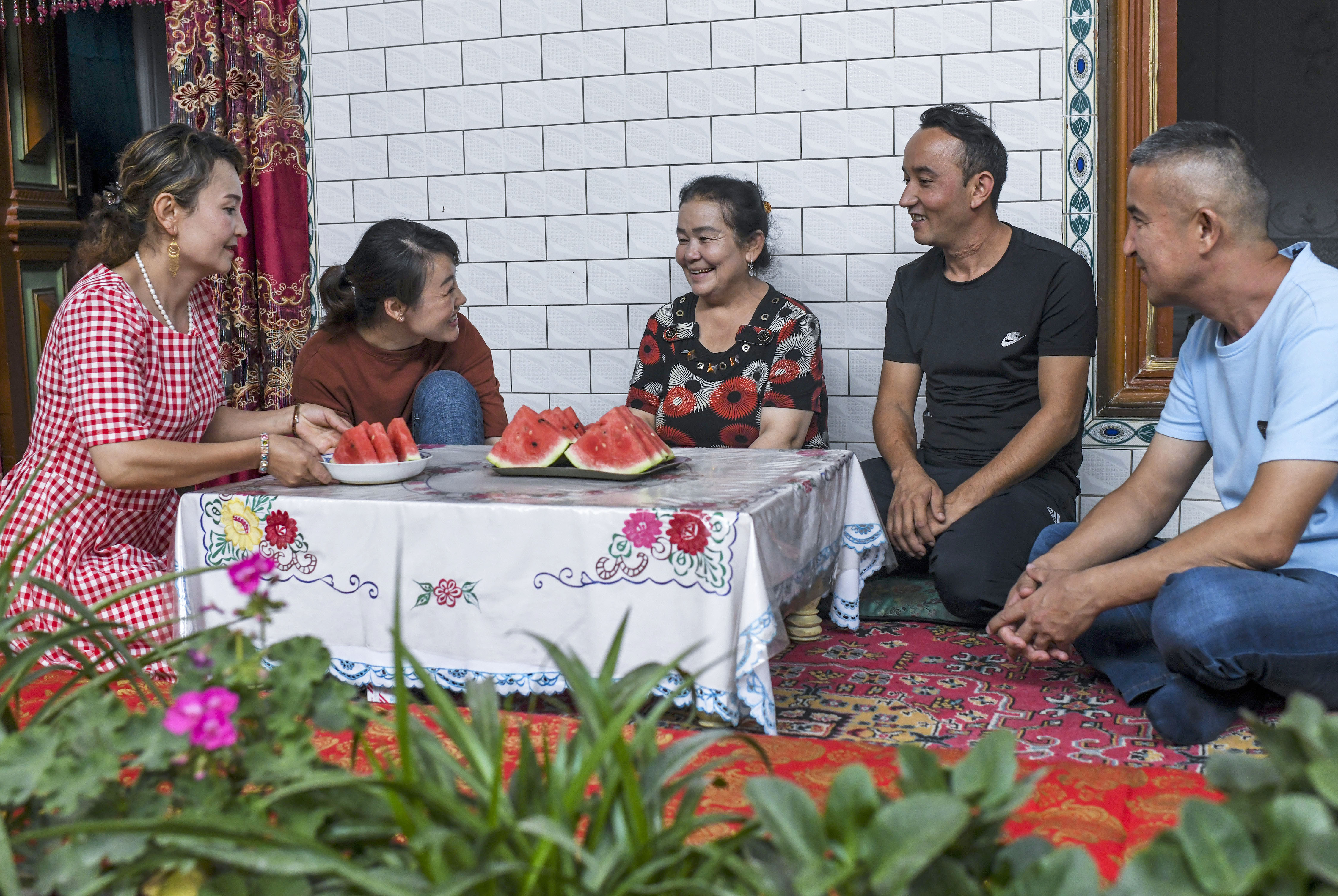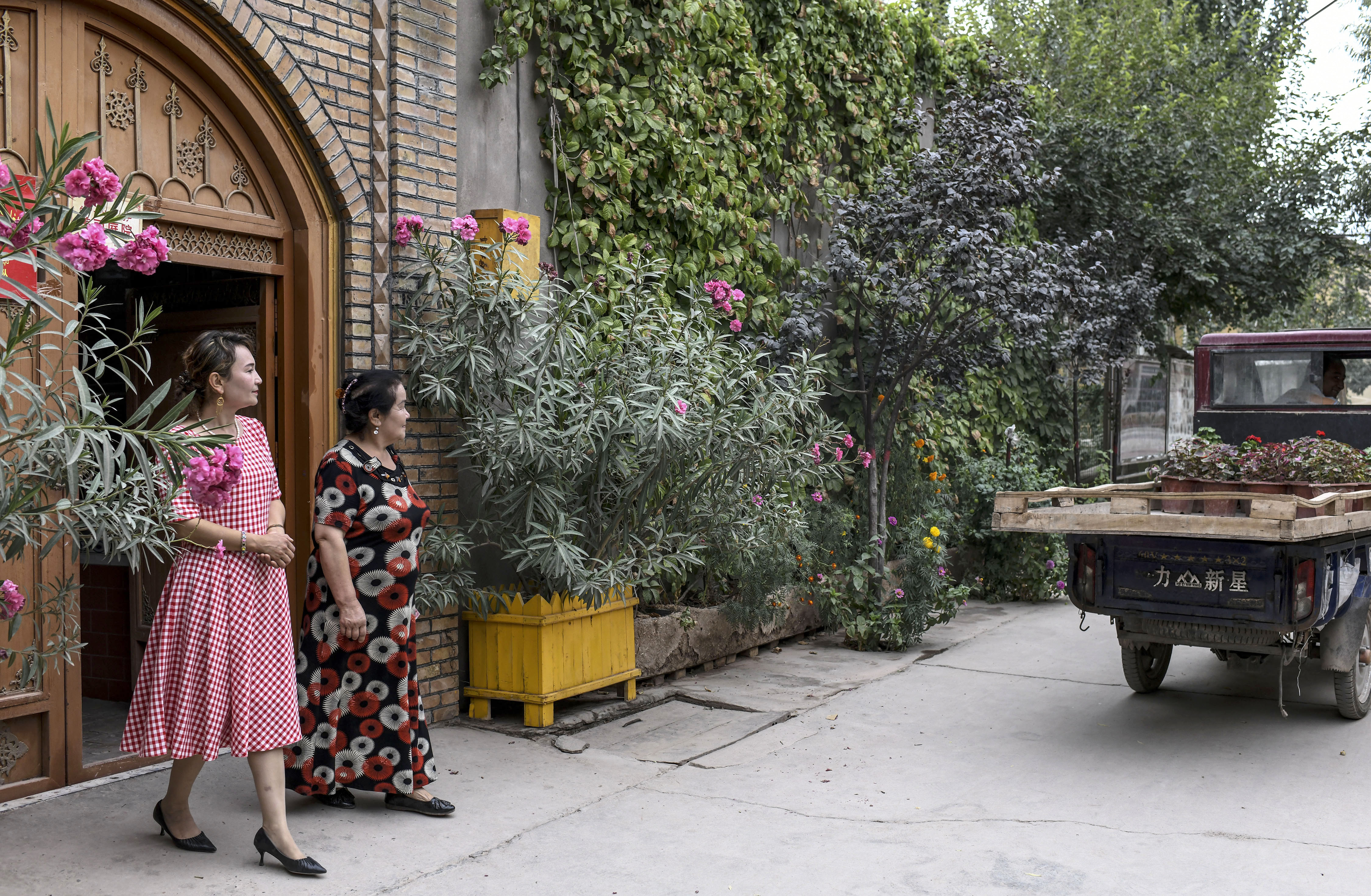 Salima Sultan (R) and her daughter Mihrigvl Rixat see a florist out in front of their home at Qianjin Village in Kashgar, northwest China's Xinjiang Uygur Autonomous Region, Aug. 18, 2019. (Xinhua/Wang Fei)