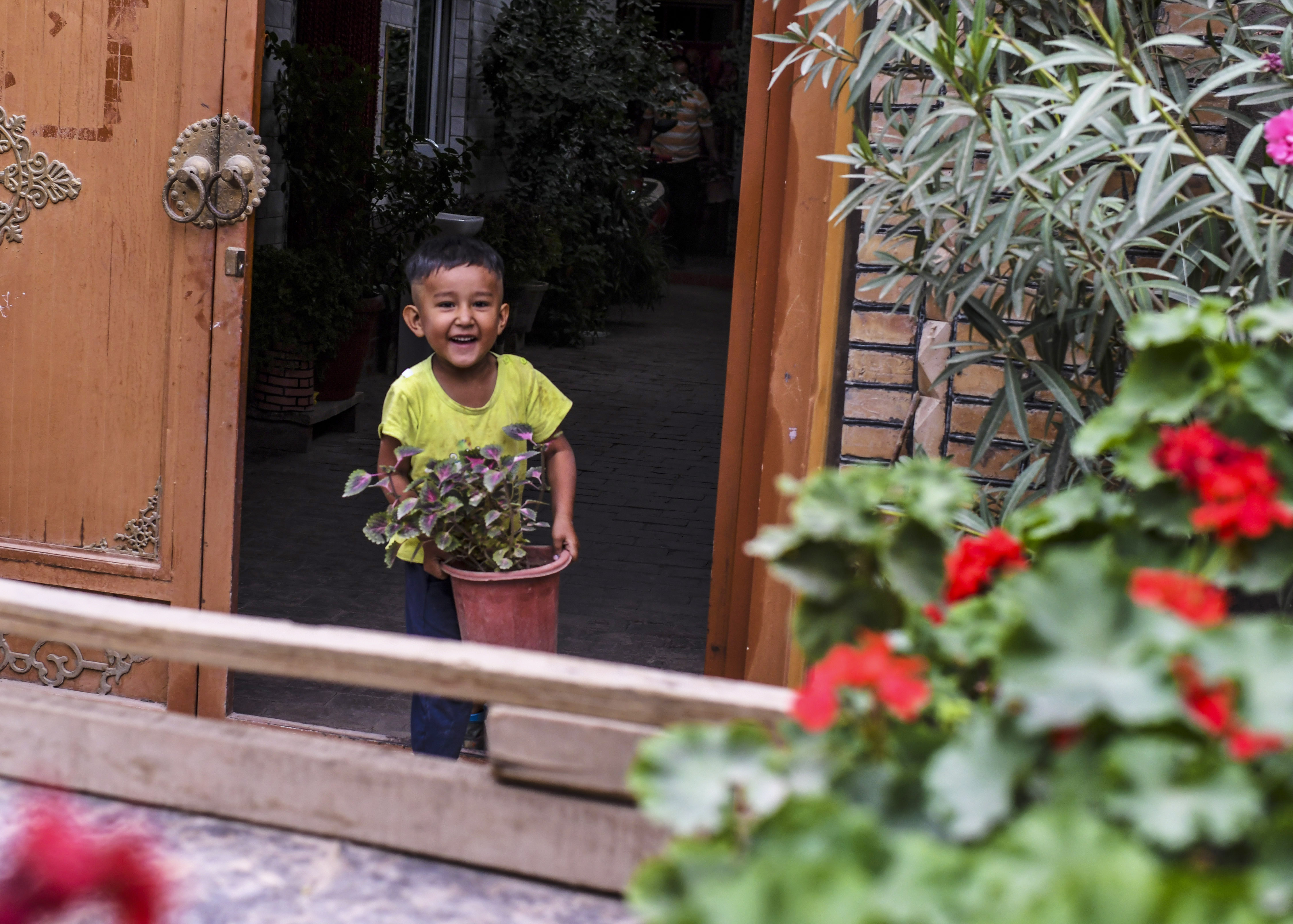 A child helps Salima Sultan load a pot of flowers onto a vehicle at Qianjin Village in Kashgar, northwest China's Xinjiang Uygur Autonomous Region, Aug. 18, 2019. (Xinhua/Wang Fei)