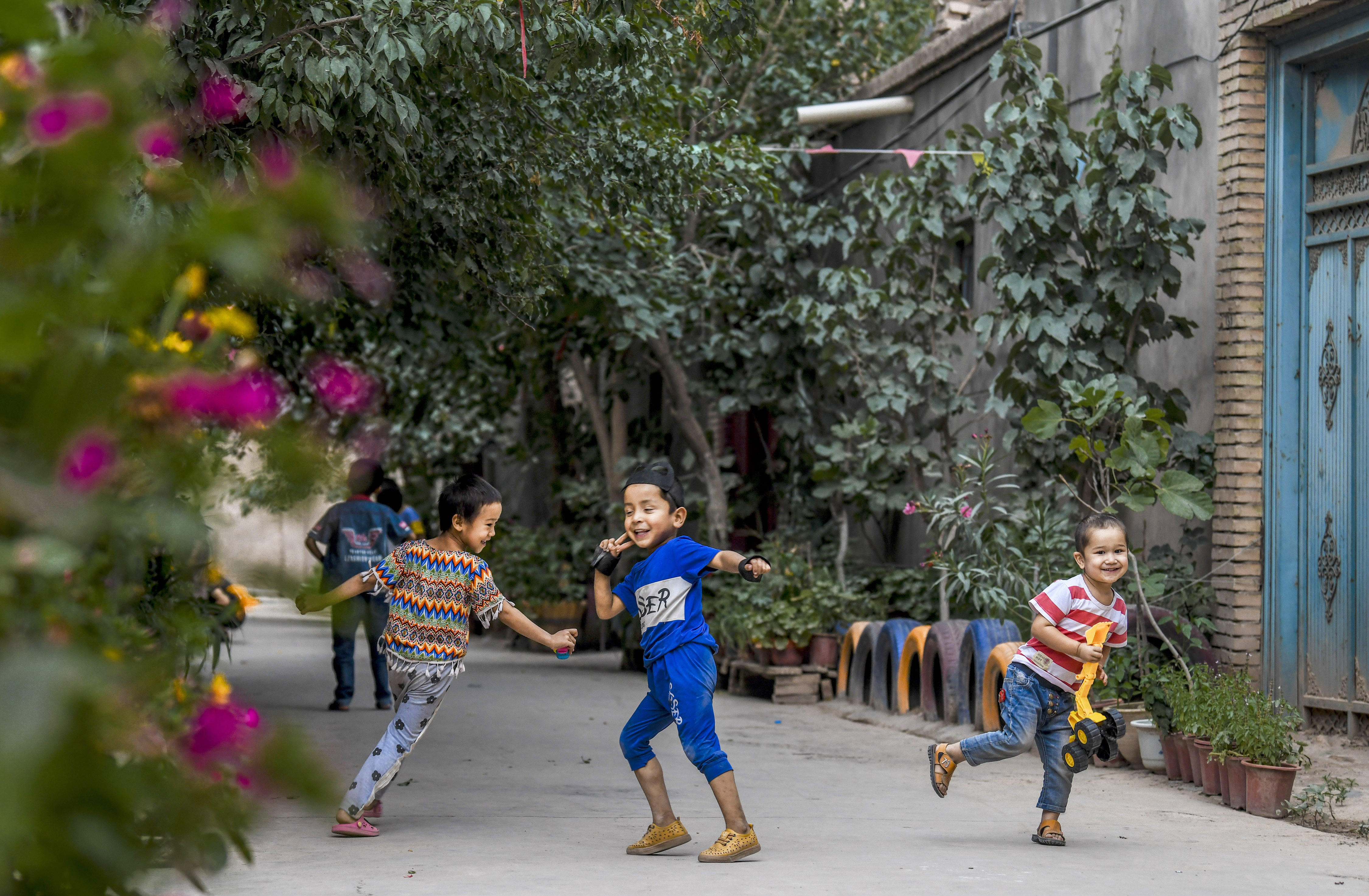 Children have fun in an alley at Qianjin Village in Kashgar, northwest China's Xinjiang Uygur Autonomous Region, Aug. 18, 2019. (Xinhua/Wang Fei)
