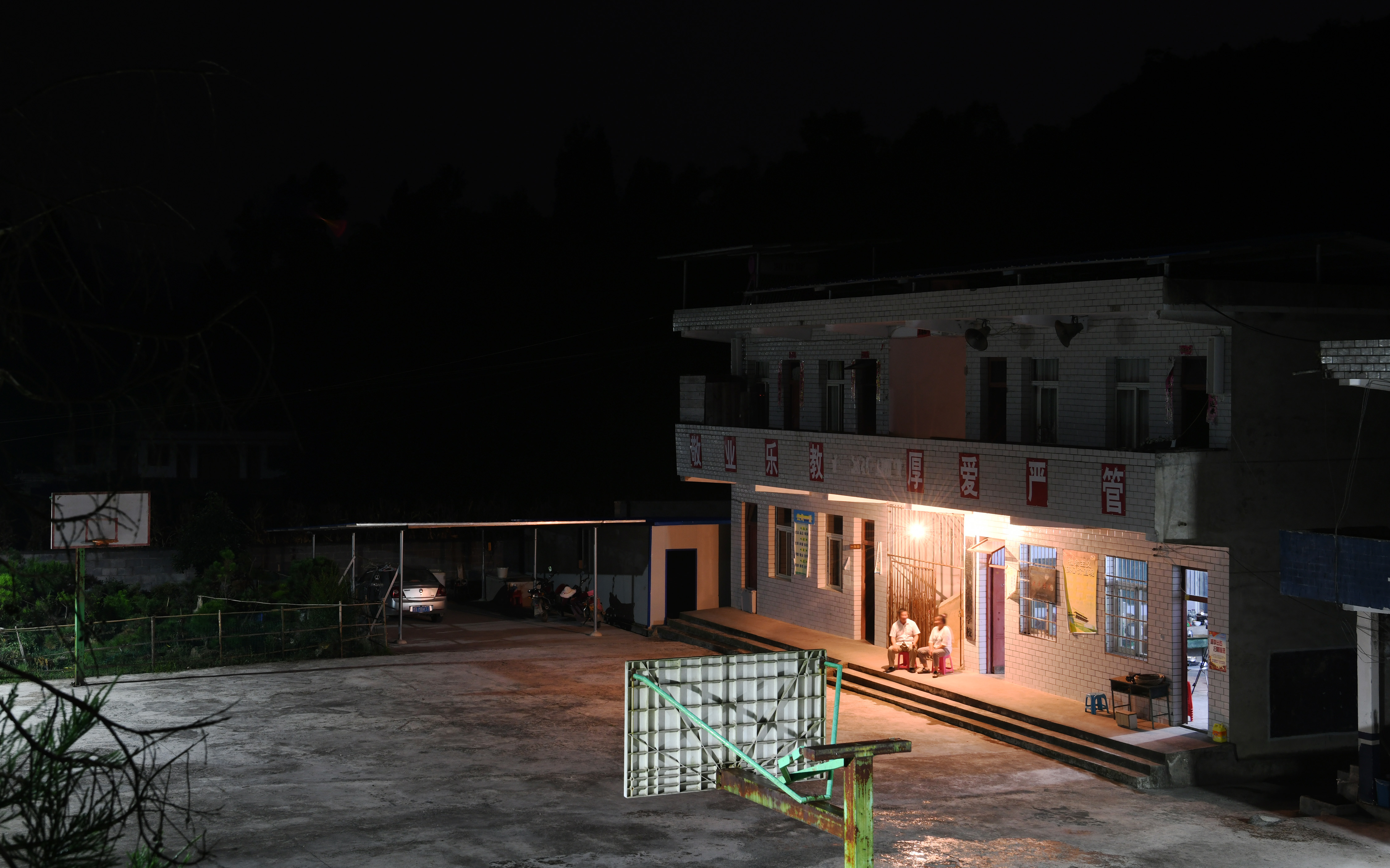 Wu Guoxian (L) and his wife enjoy the cool at night at Gugang Primary School in Liuguang Village of Longli County in Bouyei-Miao Autonomous Prefecture of Qiannan, southwest China's Guizhou Province, Aug. 26, 2019. (Xinhua/Yang Wenbin)
