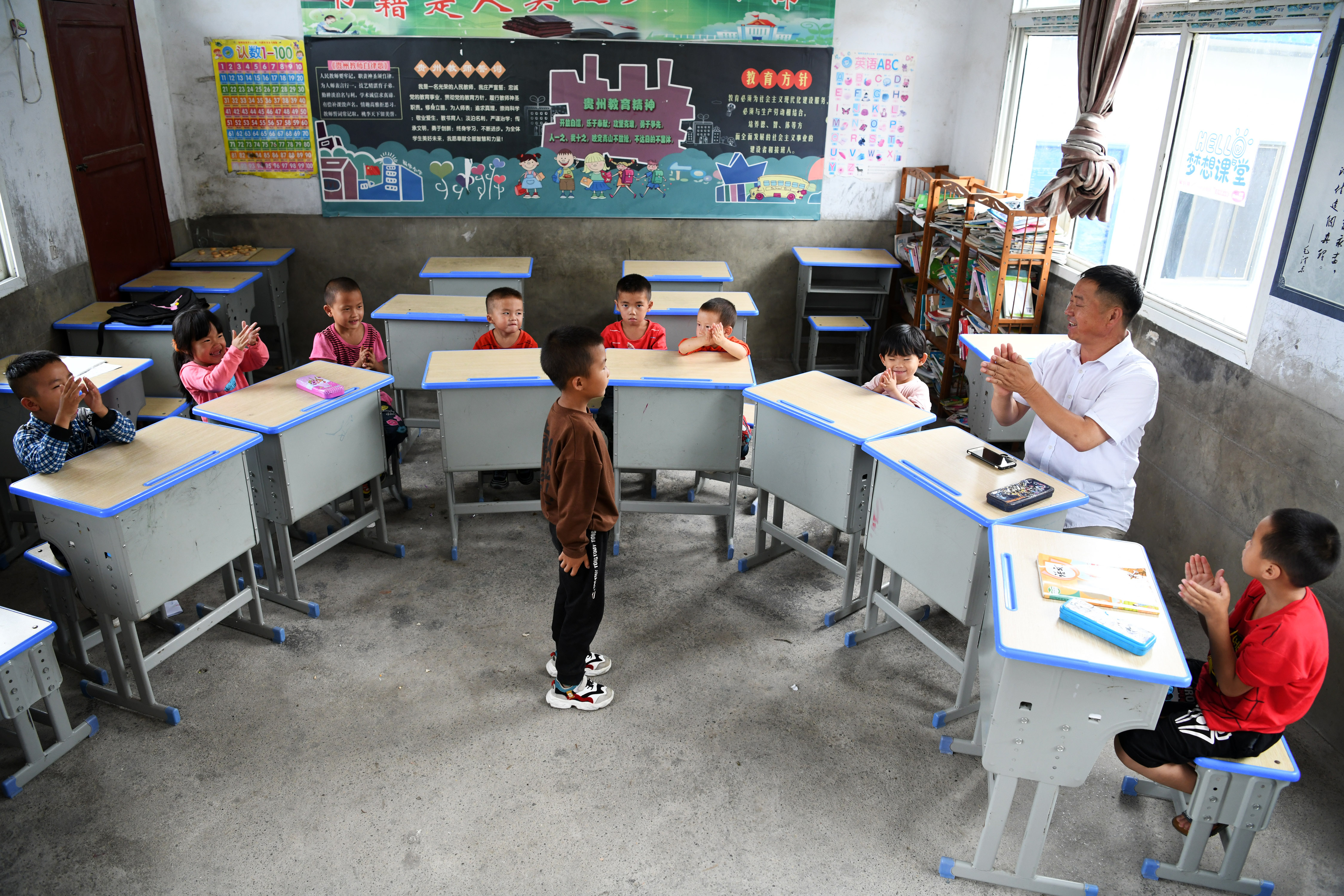 Wu Guoxian teaches drawing to preschool students at Gugang Primary School in Liuguang Village of Longli County in Bouyei-Miao Autonomous Prefecture of Qiannan, southwest China's Guizhou Province, Aug. 27, 2019.(Xinhua/Yang Wenbin)