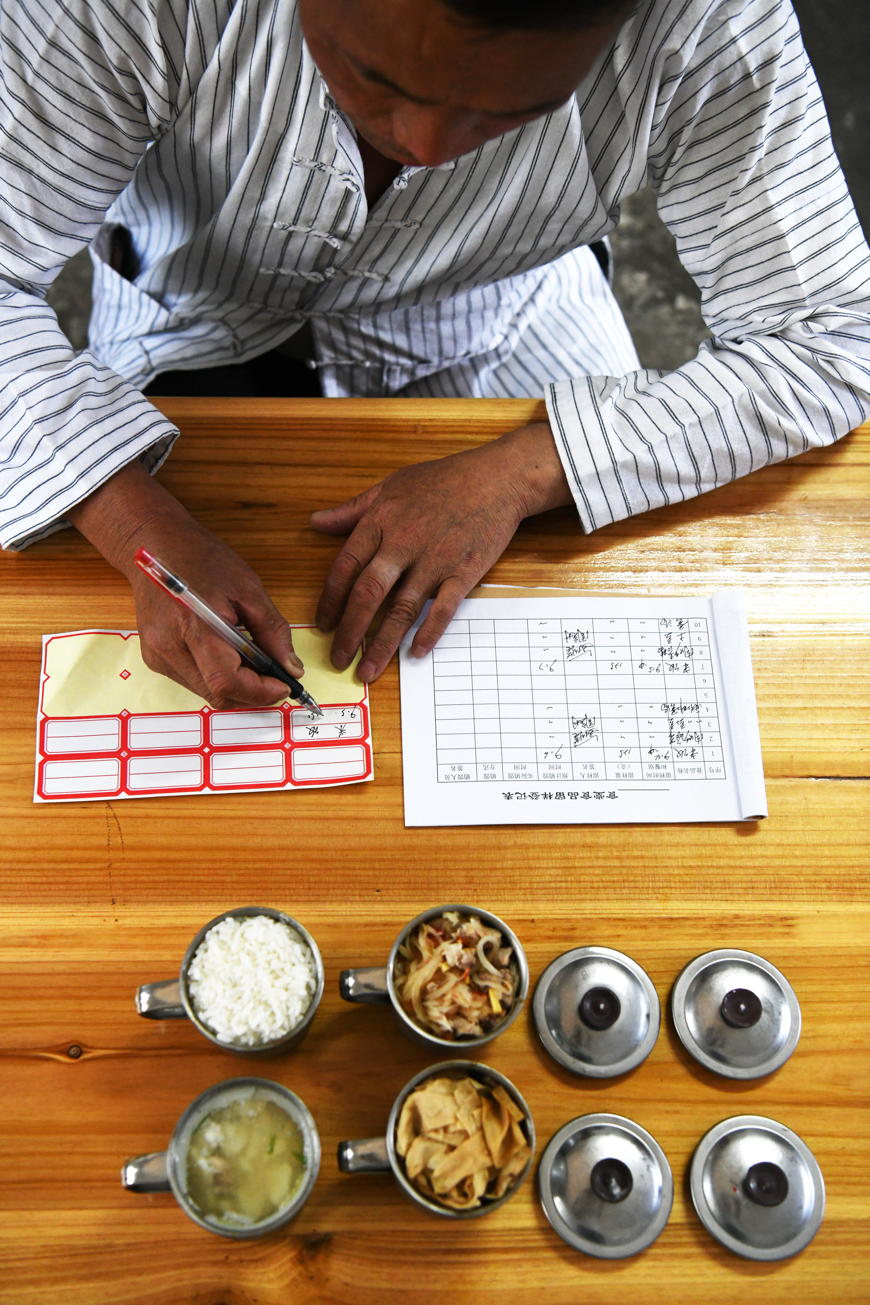 Jiang Tongying registers samples of children's lunch at Hua'ao primary school in Jianhe County of Qiandongnan Miao and Dong Autonomous Prefecture, southwest China's Guizhou Province, Sept. 5, 2019. (Xinhua/Yang Wenbin)
