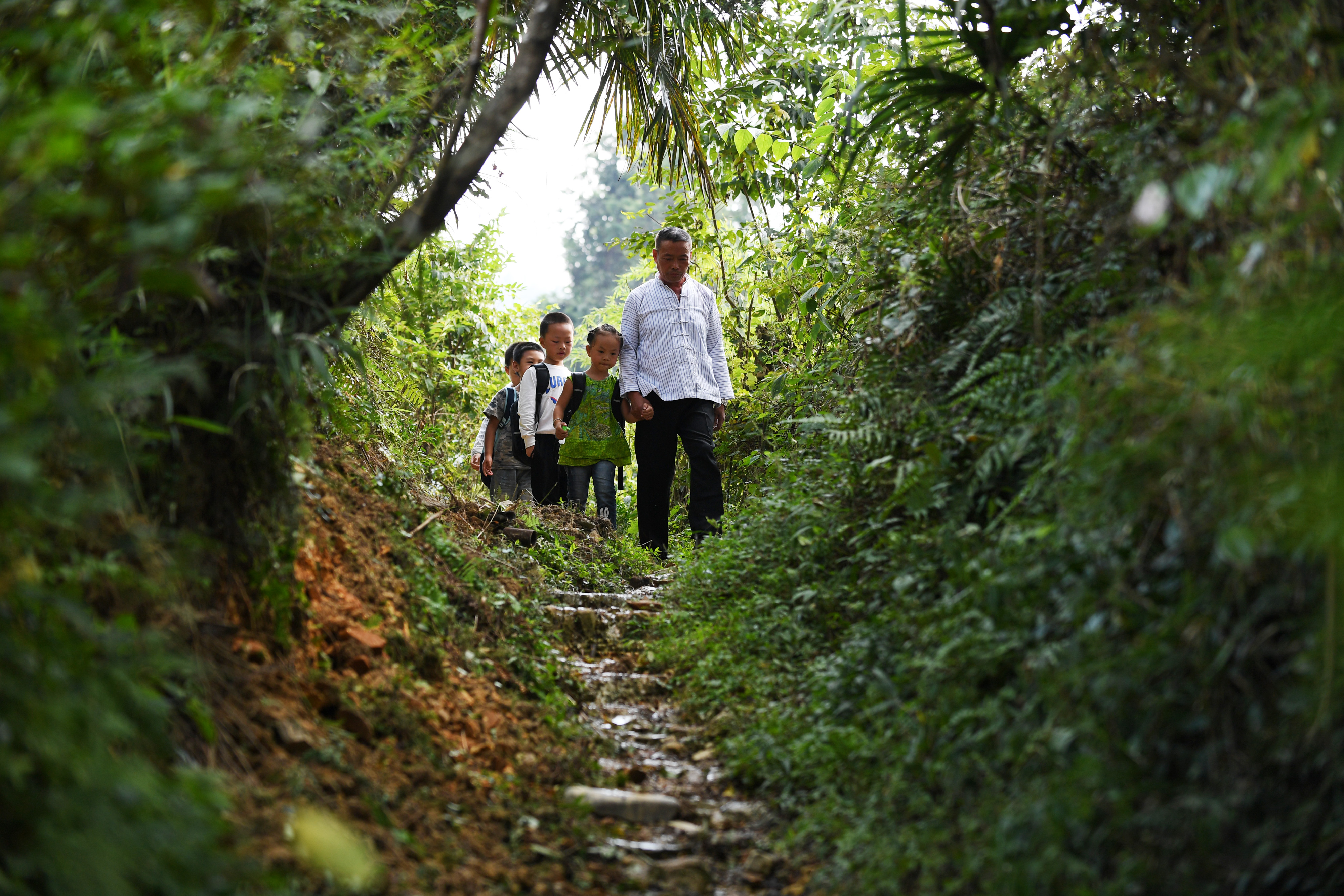 Jiang Tongying escorts children back home after school at Hua'ao Village in Jianhe County of Qiandongnan Miao and Dong Autonomous Prefecture, southwest China's Guizhou Province, Sept. 5, 2019. (Xinhua/Yang Wenbin)