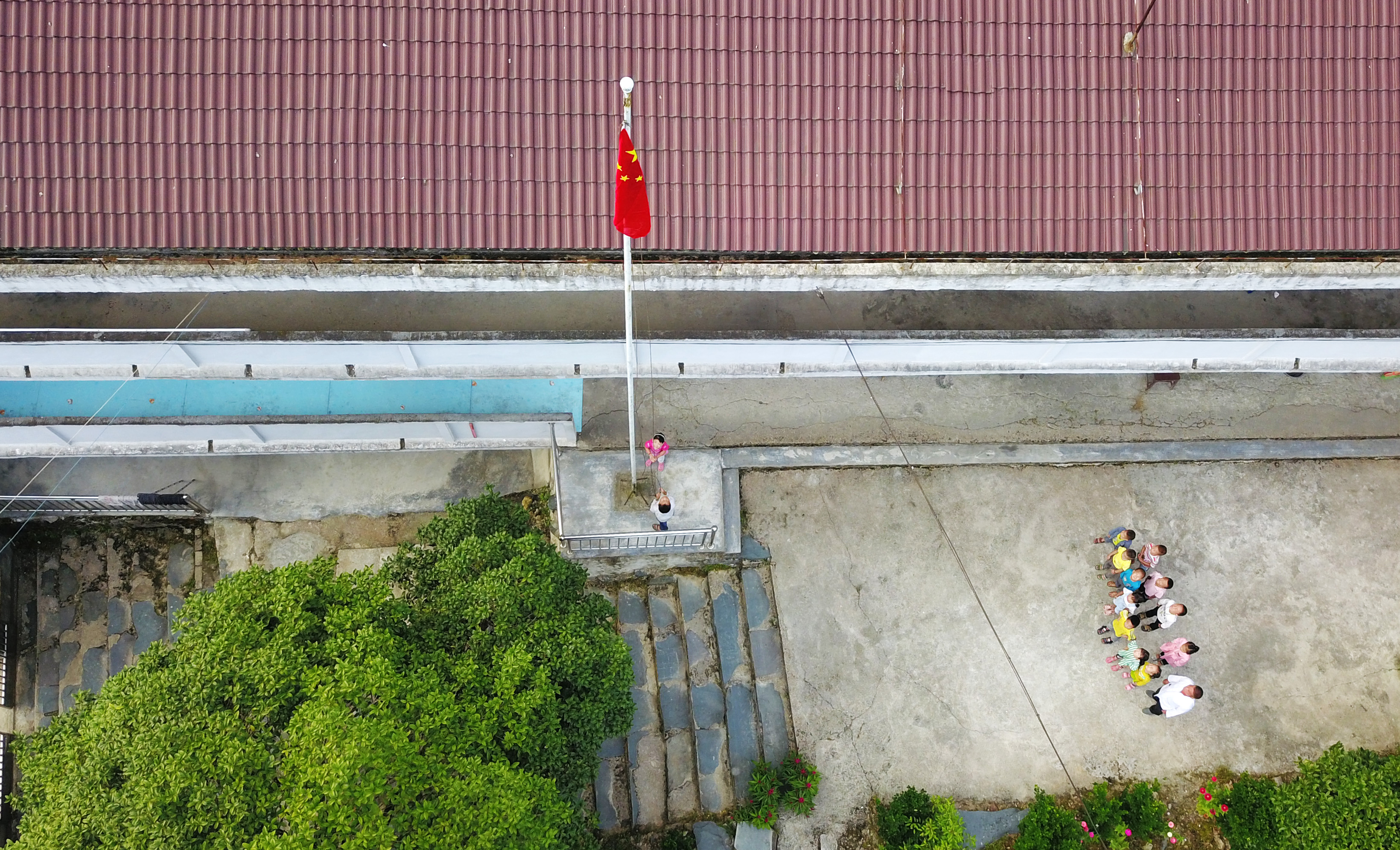 Aerial Photo taken on Sept. 6, 2019 shows Jiang Tongying and Children attending a flag-rising ceremony at Hua'ao primary school in Jianhe County of Qiandongnan Miao and Dong Autonomous Prefecture, southwest China's Guizhou Province. (Xinhua/Yang Wenbin)