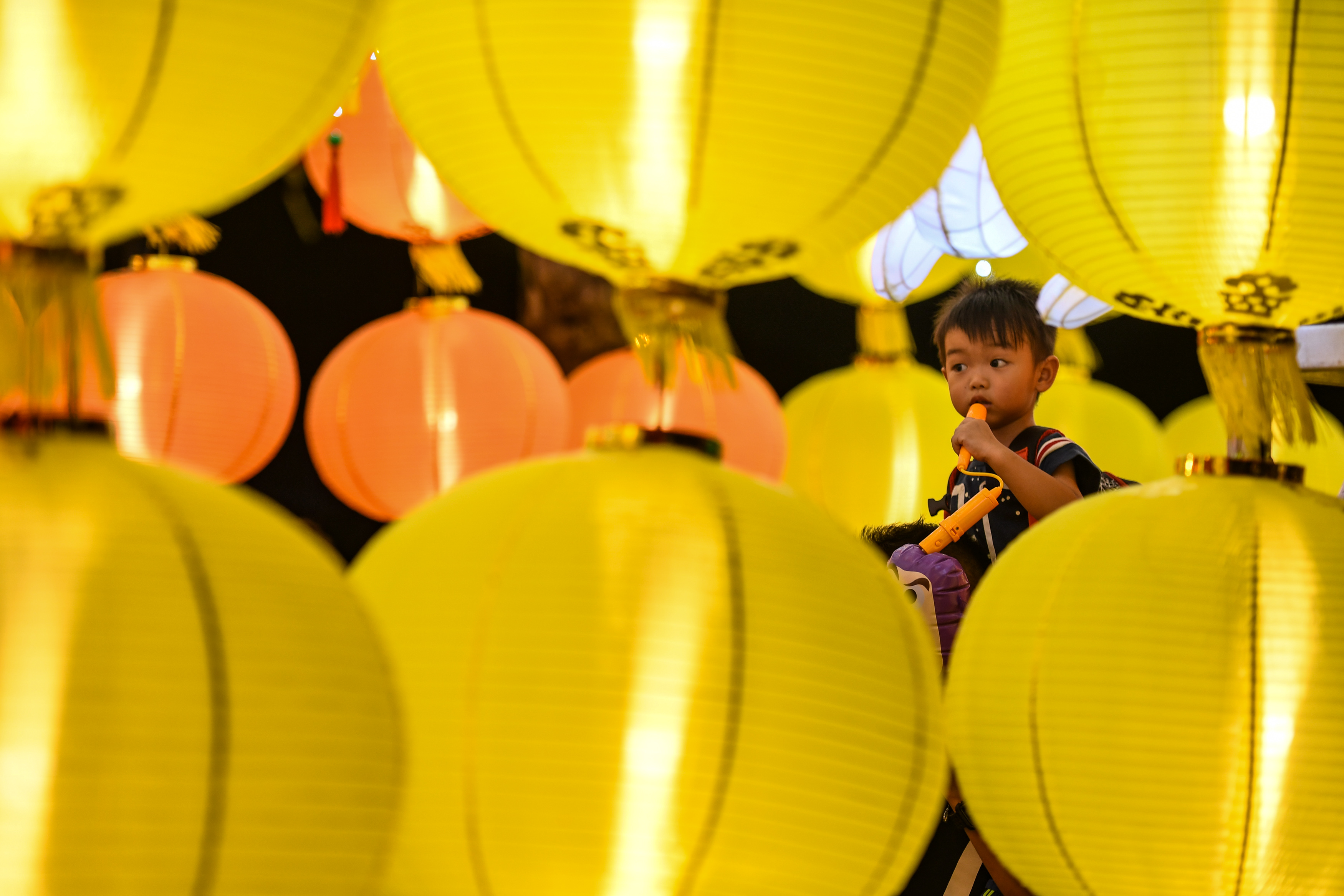A boy views lanterns at a lantern fair celebrating the Mid-Autumn Festival at Victoria Park in Hong Kong, south China, Sept. 13, 2019. (Xinhua/Mao Siqian)