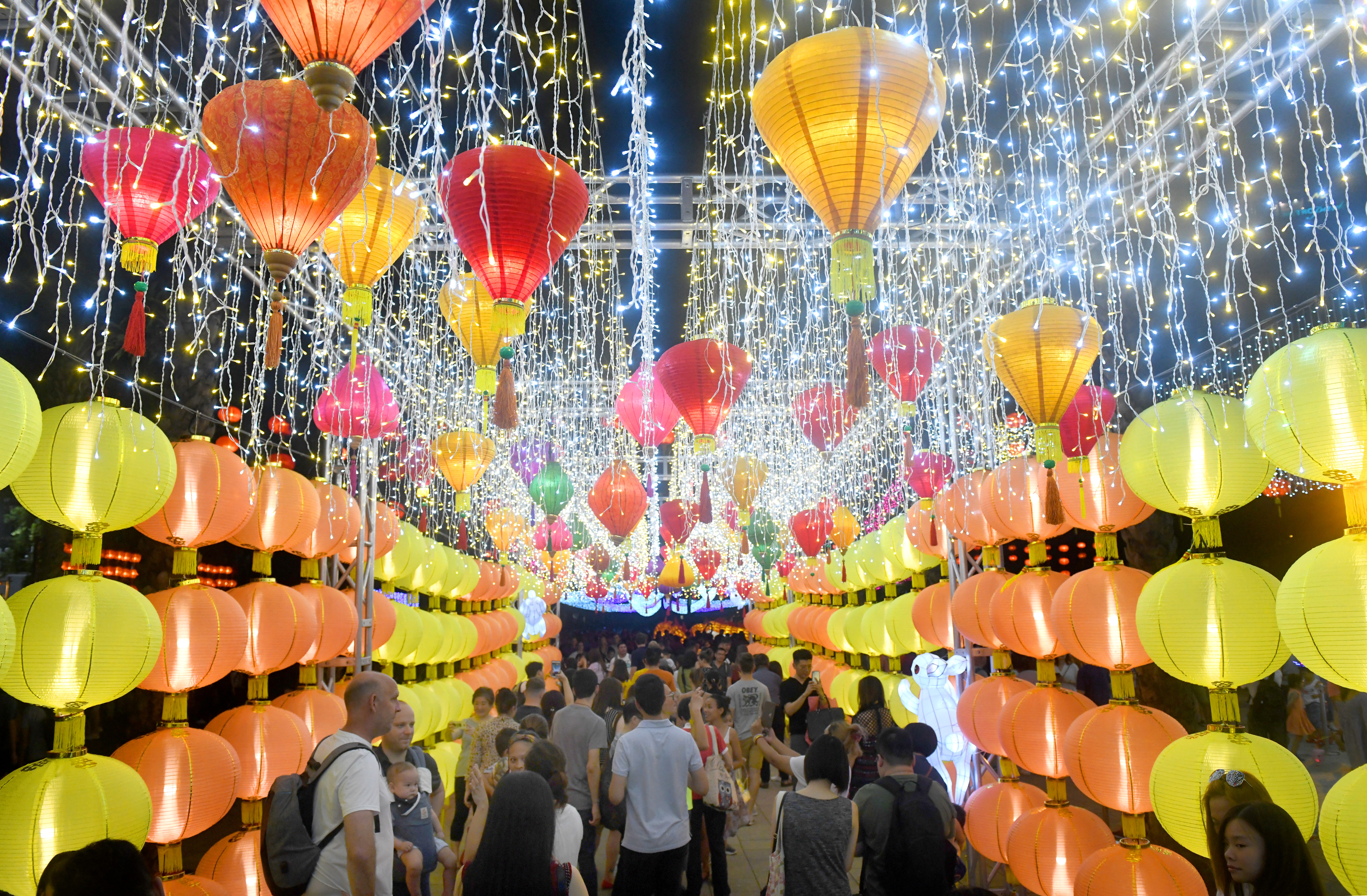 People view lanterns at a lantern fair celebrating the Mid-Autumn Festival at Victoria Park in Hong Kong, south China, Sept. 13, 2019. (Xinhua/Lu Hanxin)