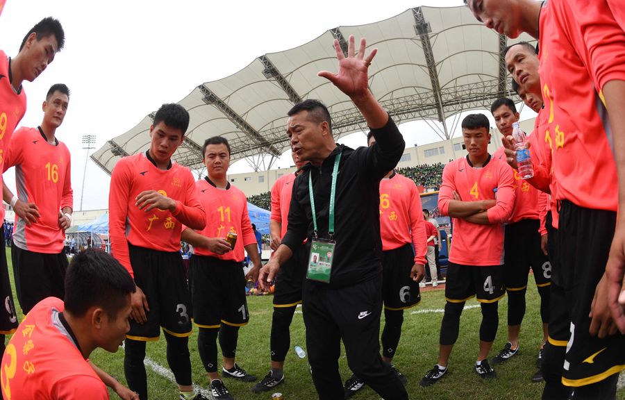 Tan Yimou (front, C), coach of Team Guangxi, gives instructions before a sparkler-grabbing game at the 11th National Traditional Games of Ethnic Minorities of the People's Republic of China in Zhengzhou, central China's Henan Province, Sept. 14, 2019. (Xinhua/Huang Xiaobang)