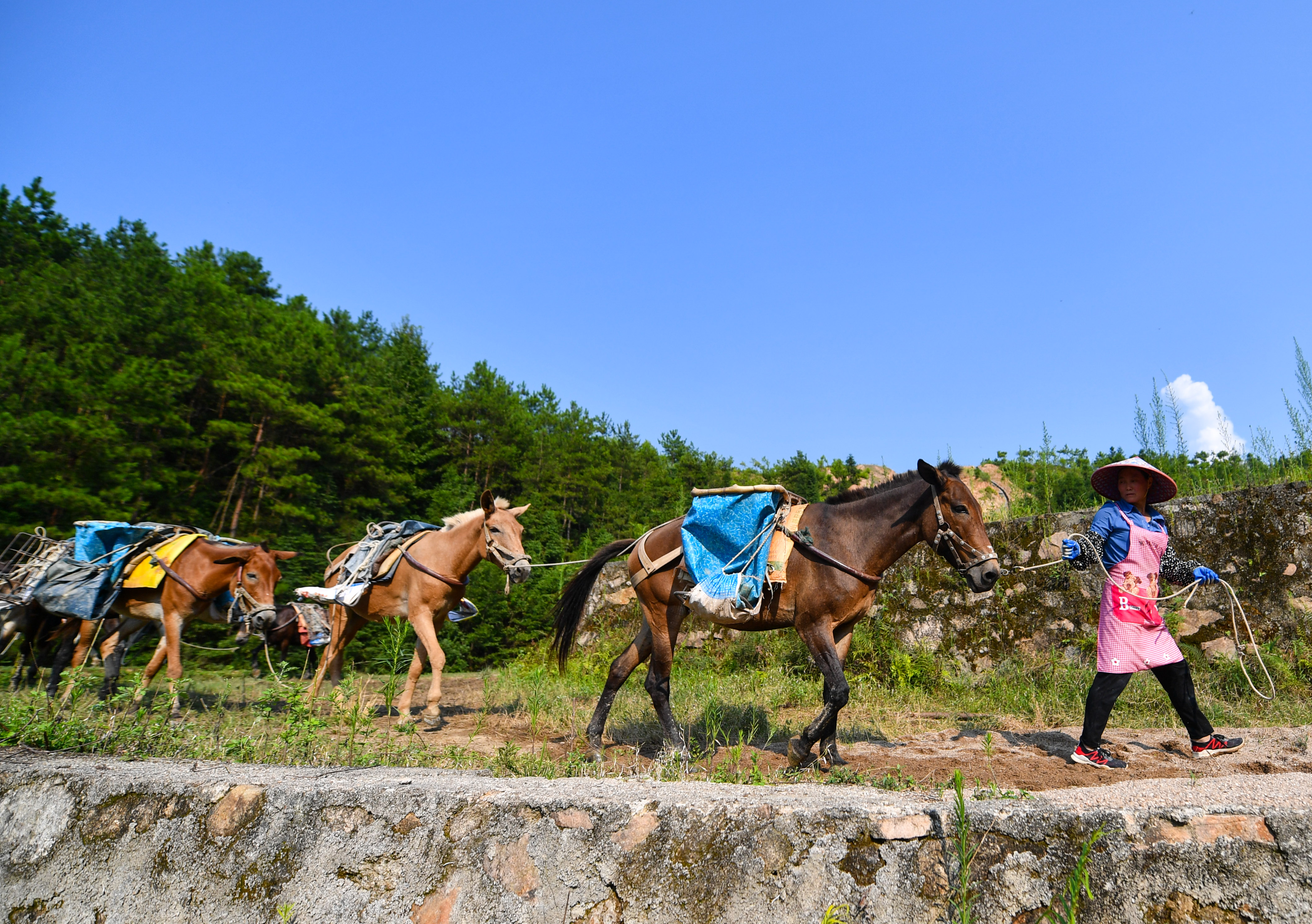A horse caravan is on the way back in Xingguo County of east China's Jiangxi Province, Aug. 16, 2019. (Xinhua/Hu Chenhuan)