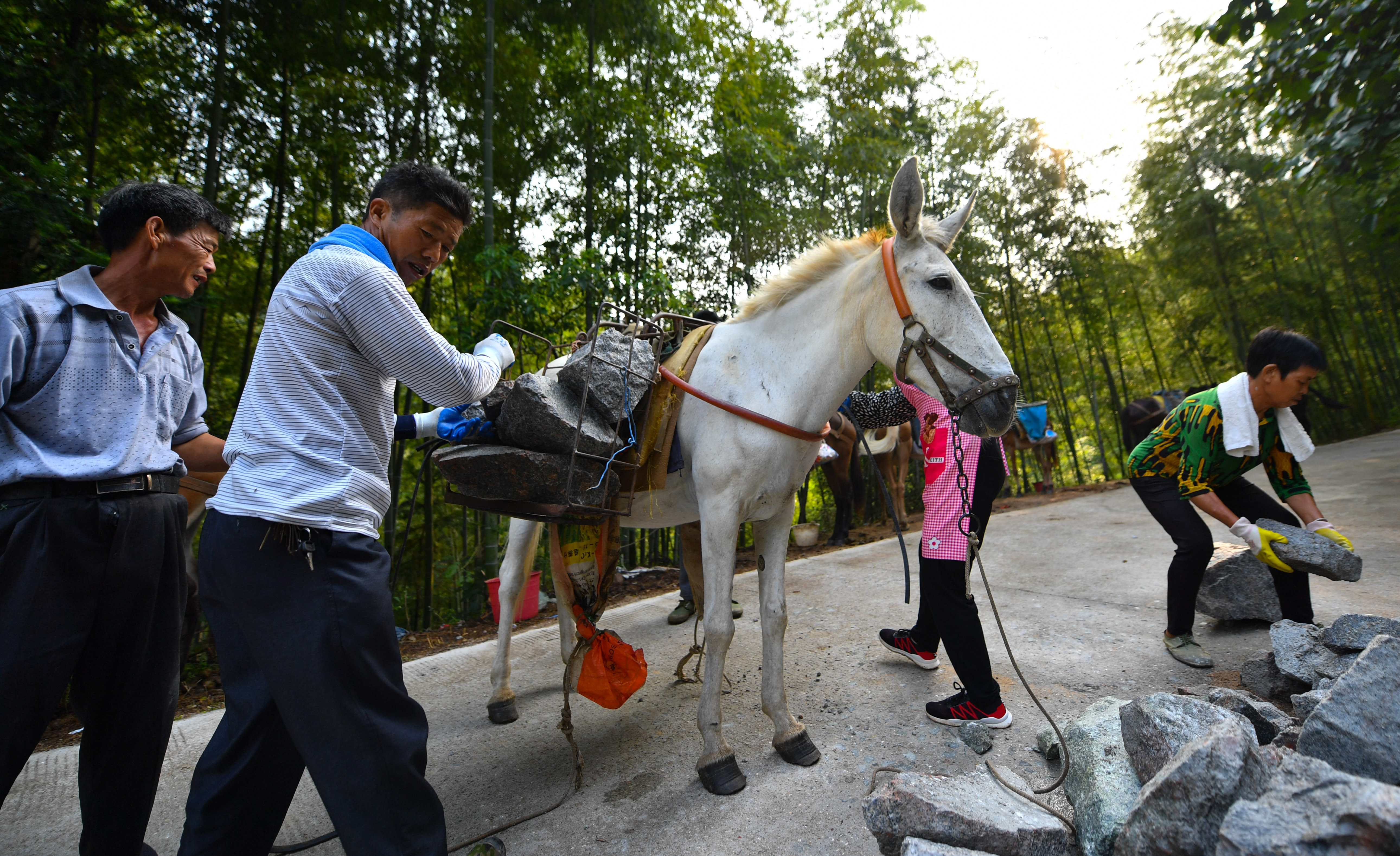 People load stones on a mule in Xingguo County of east China's Jiangxi Province, Aug. 16, 2019. (Xinhua/Hu Chenhuan)