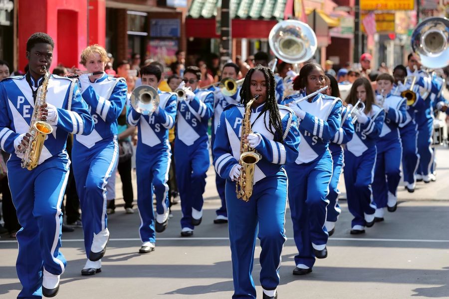 A band participate in a parade to celebrate the upcoming Chinese National Day in Chinatown of Chicago, the United States, on Sept.15, 2019. (Xinhua/Wang Ping)