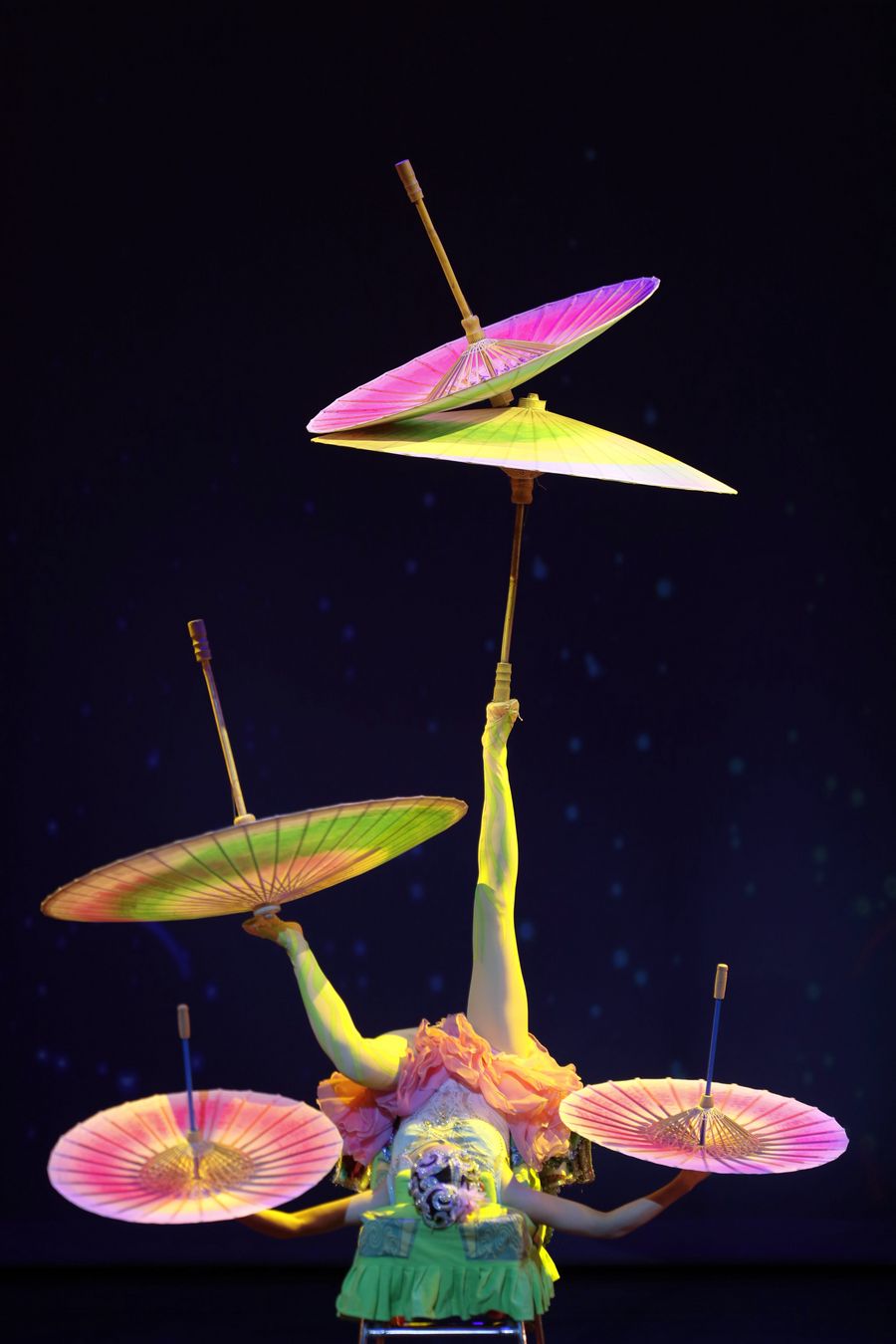 An actress from China National Acrobatic Troupe performs "Umbrella Spinning" in Houston of Texas, the United States, on Oct. 4, 2019. (Photo by Steven Song/Xinhua)