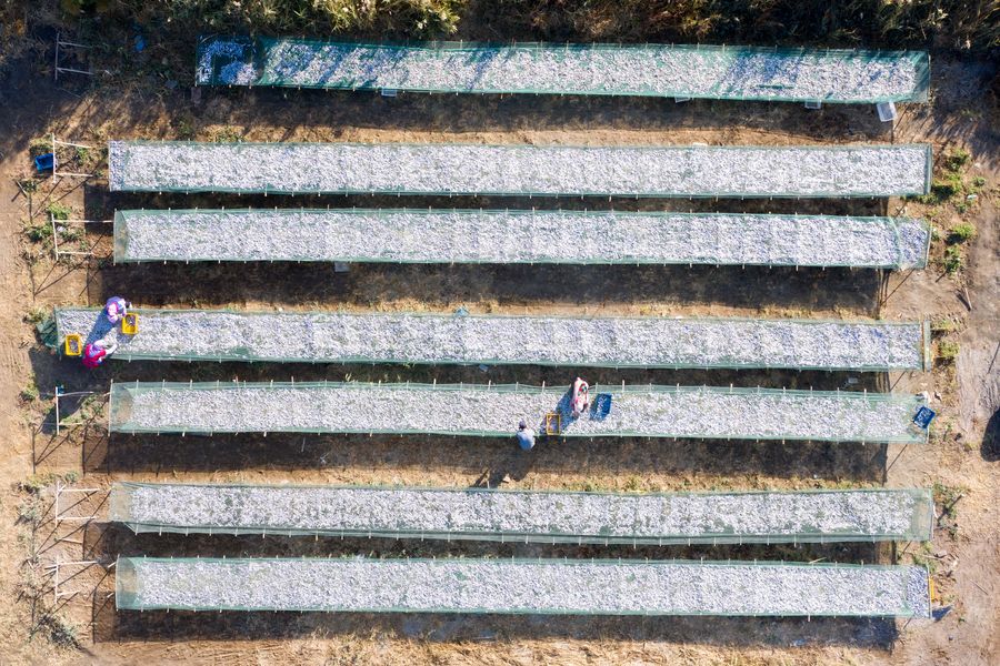 In this aerial photo taken on Oct. 12, 2019, local fishermen sun-dry pond smelts harvested from Bosten Lake in Bohu County, northwest China's Xinjiang Uygur Autonomous Region.(Xinhua/Ding Lei)