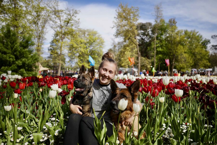 A woman poses with dogs for photos at Floriade, an annual flower and entertainment festival, at the Commonwealth Park in Canberra, Australia, Oct. 13, 2019. (Photo by Chu Chen/Xinhua)