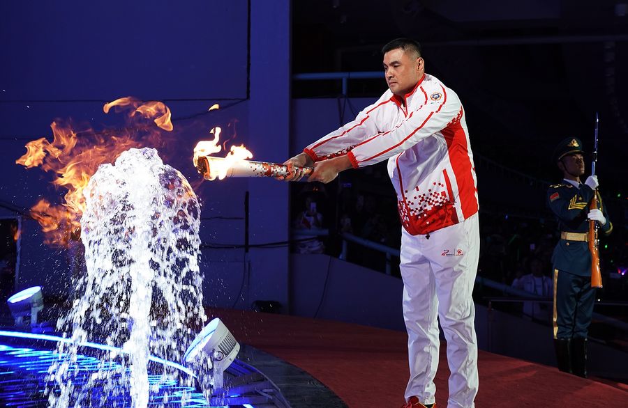 Torchbearer Liu Yudong lights the cauldron during the opening ceremony of the 7th CISM Military World Games in Wuhan, capital of central China's Hubei Province, Oct. 18, 2019. (Xinhua/Jin Liangkuai)