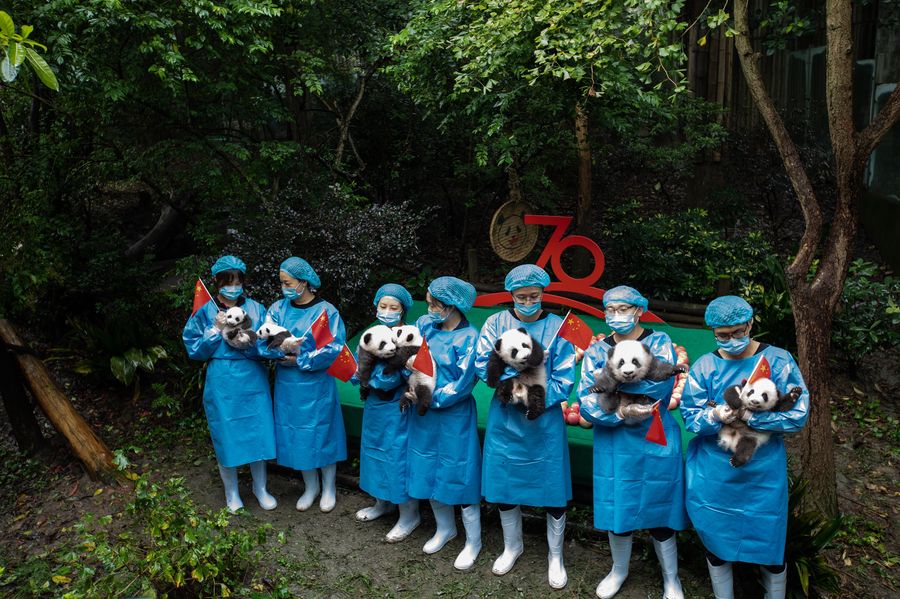 Breeders holding giant panda cubs pose for photos at Chengdu Research Base of Giant Panda Breeding in Chengdu, capital of southwest China's Sichuan Province, on Sept. 24, 2019. (Xinhua/Jiang Hongjing)