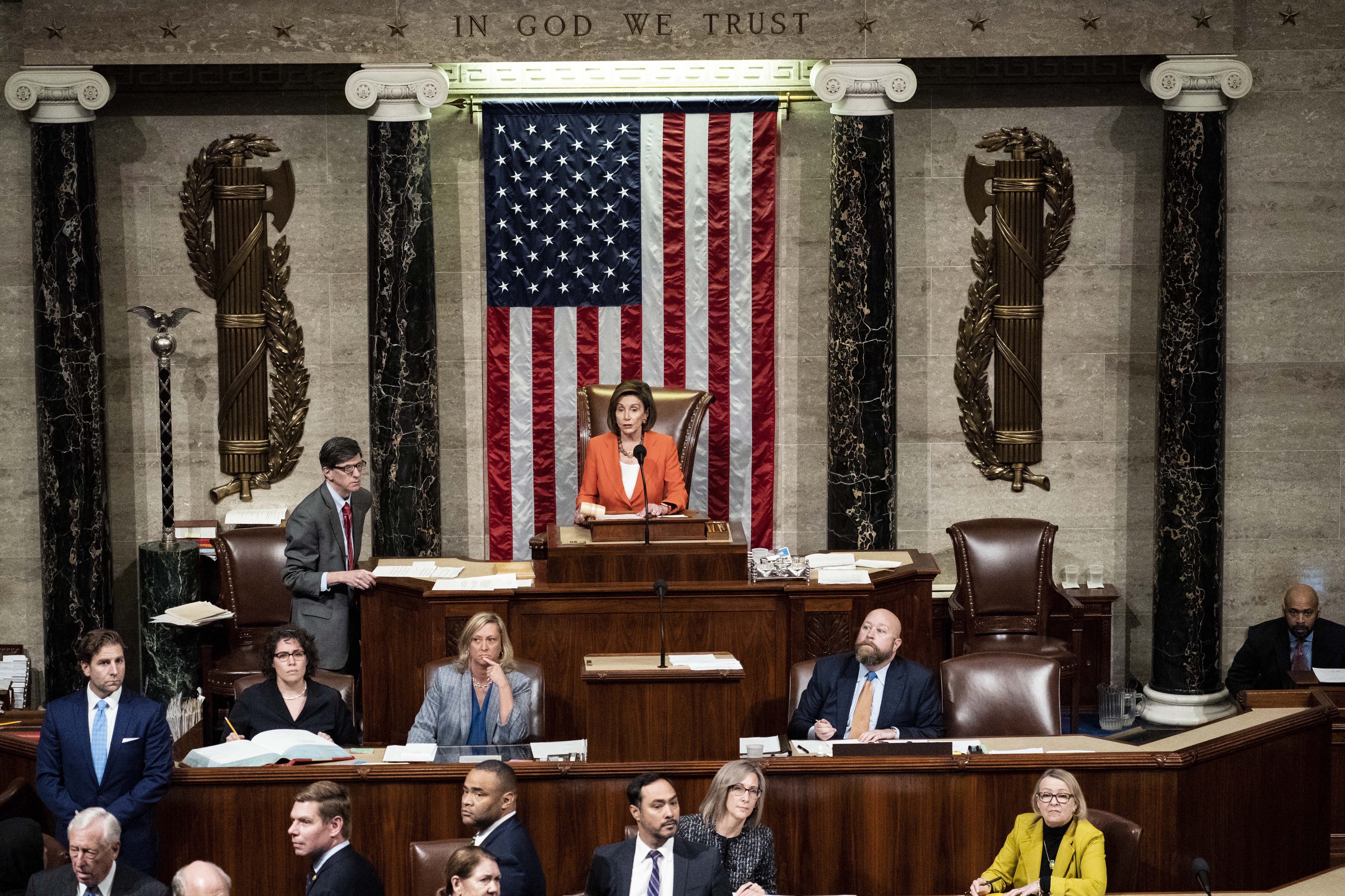 U.S. House Speaker Nancy Pelosi (rear, C) presides over a vote by the House of Representatives on a resolution formalizing an impeachment inquiry into President Donald Trump, on Capitol Hill in Washington D.C., the United States, on Oct. 31, 2019. The U.S. House of Representatives voted on Thursday to approve a resolution designed to formalize proceedings of an impeachment inquiry into President Donald Trump. (Melina Mara/Pool via Xinhua)
