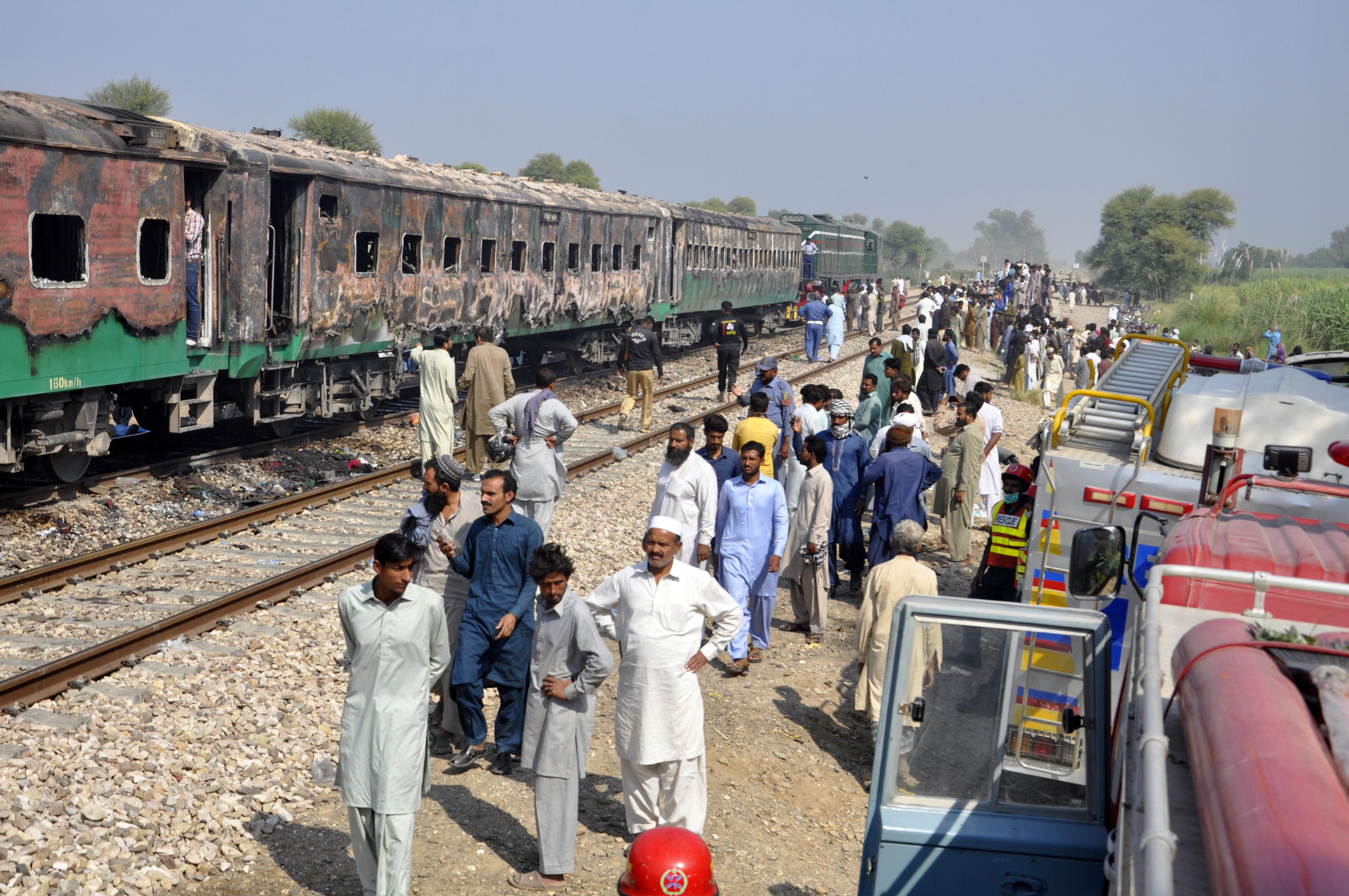 Rescuers and local people work after a passenger train caught fire in Rahim Yar Khan district of Pakistan's east Punjab province on Oct. 31, 2019. At least 65 people were killed and 14 others injured after a passenger train caught fire in Rahim Yar Khan district of Pakistan's east Punjab province on Thursday, a rescue official and local reports said. The death toll is feared to rise as rescue work continues to recover more bodies from the compartments gutted in the fire, Baqir Hussain, district emergency officer of state-owned Rescue 1122, told Xinhua. (Str/Xinhua)