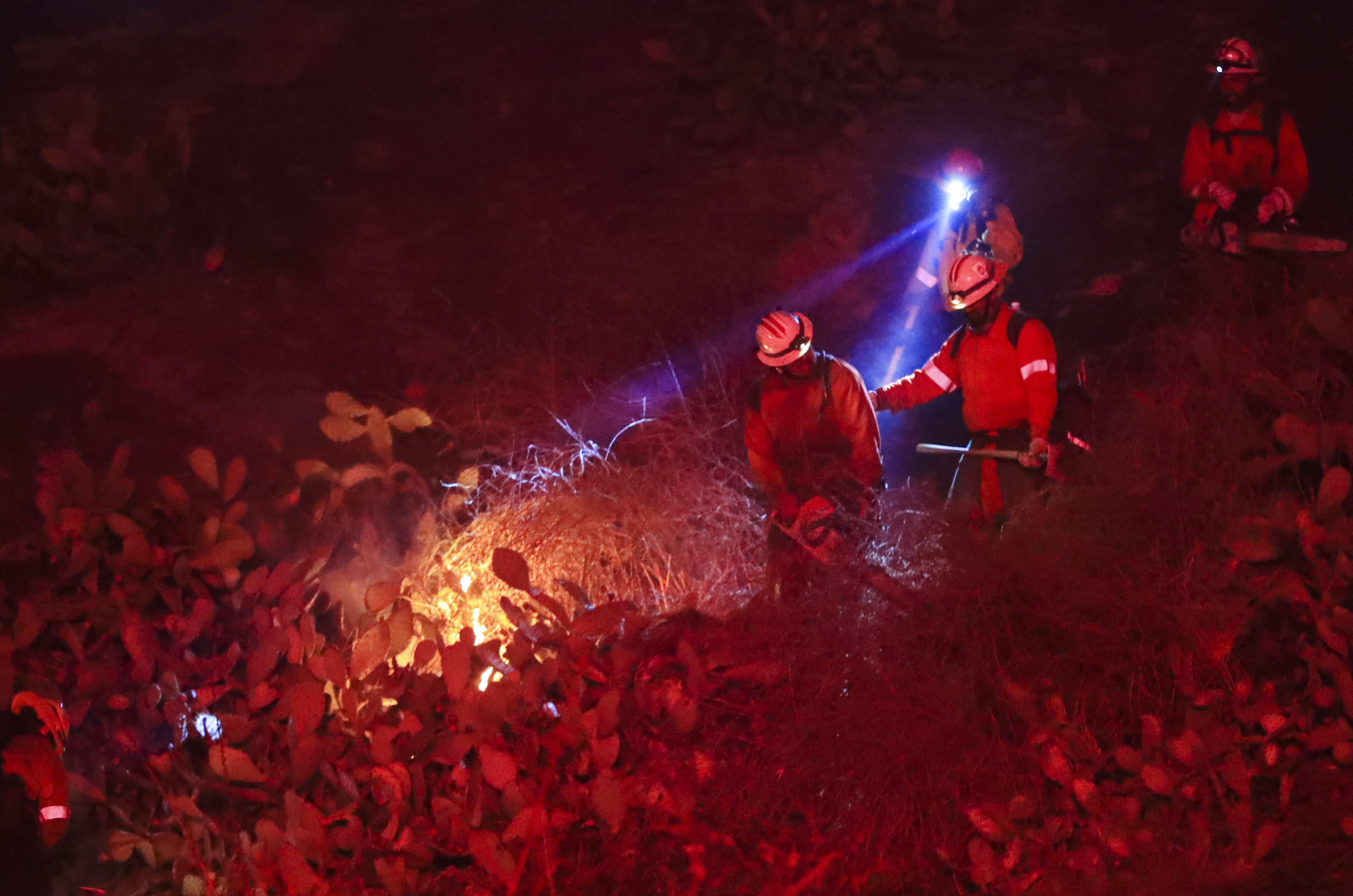 Firefighters work to put out a wildfire in Fullerton, California, the United States, on Oct. 30, 2019. As of Wednesday, as many as 10 brutal wildfires were burning throughout the Golden State. The latest one is the Castlewood Fire in Fullerton, which was ignited Wednesday evening. (Xinhua/Li Ying)