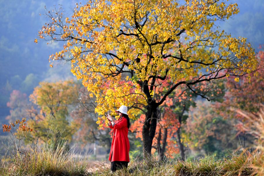 A tourist takes photos of the autumn scenery at the foot of Dabieshan Mountain, Nov. 3, 2019. (Photo by Hao Yuan/Xinhua)