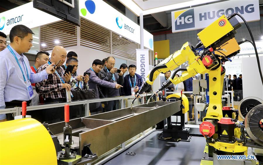 People watch welding robots operating at the Equipment exhibition area during the second China International Import Expo (CIIE) in Shanghai, east China, Nov. 6, 2019. The National Exhibition and Convention Center in Shanghai greeted a large number of visitors on the second day of the CIIE. (Xinhua/Fang Zhe)