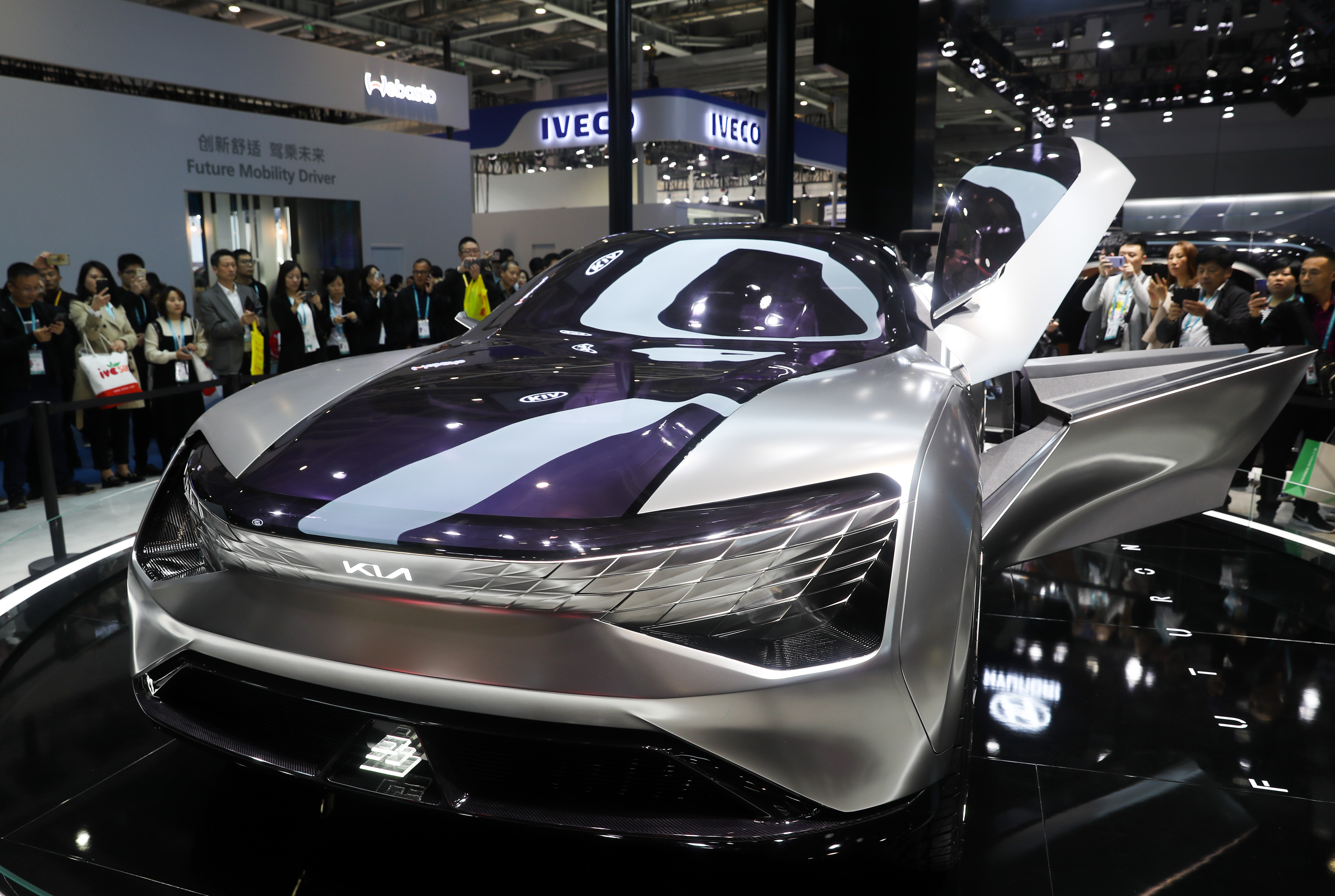 Visitors look at a concept car of Kia Motors at the Automobile exhibition area during the second China International Import Expo (CIIE) in Shanghai, east China, Nov. 8, 2019.(Xinhua/Ding Ting)
