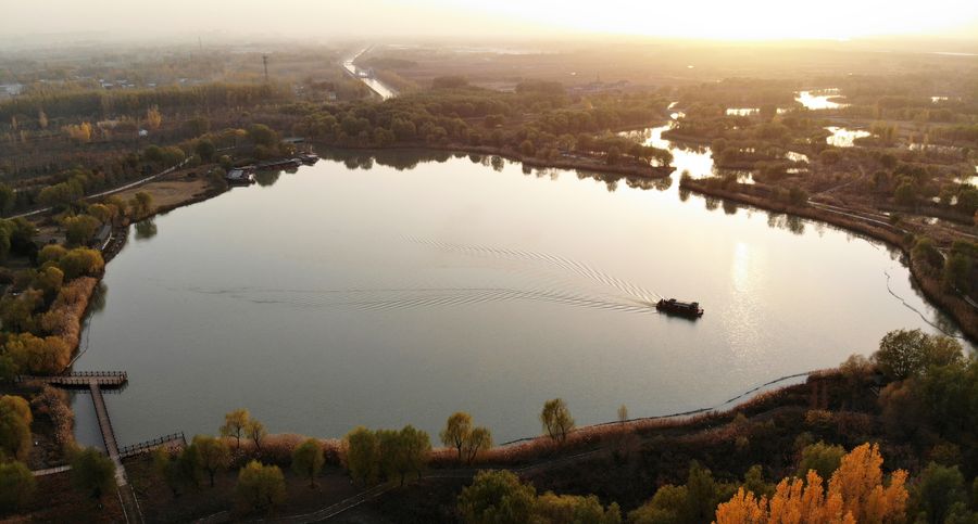 Aerial photo taken on Nov. 18, 2019 shows a view of the Jixi national wetland, located in western Jinan, east China's Shandong Province.(Xinhua/Wang Kai)