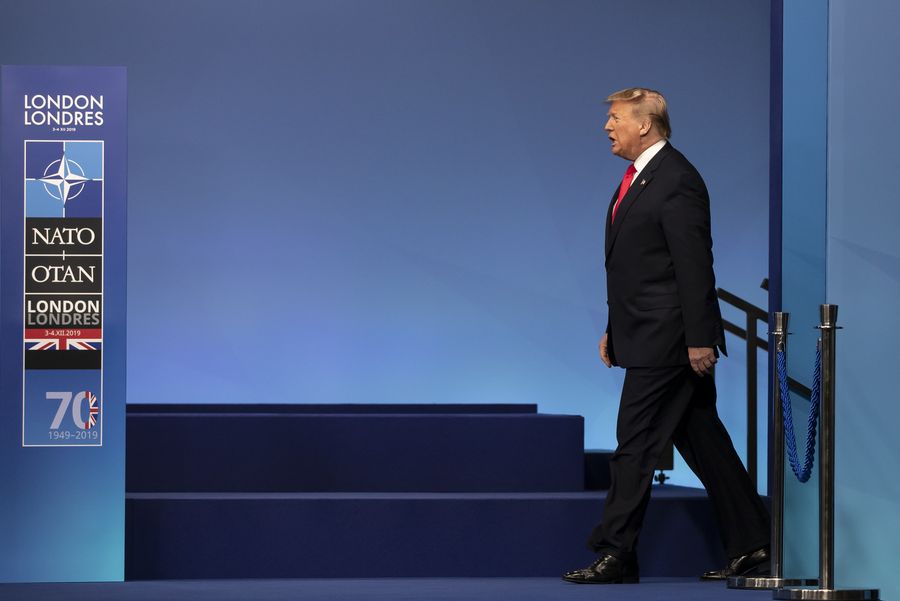 U.S. President Donald Trump arrives for the official handshake ceremony at NATO (North Atlantic Treaty Organisation) Summit in London, Britain on Dec. 4, 2019. (Xinhua/Han Yan)