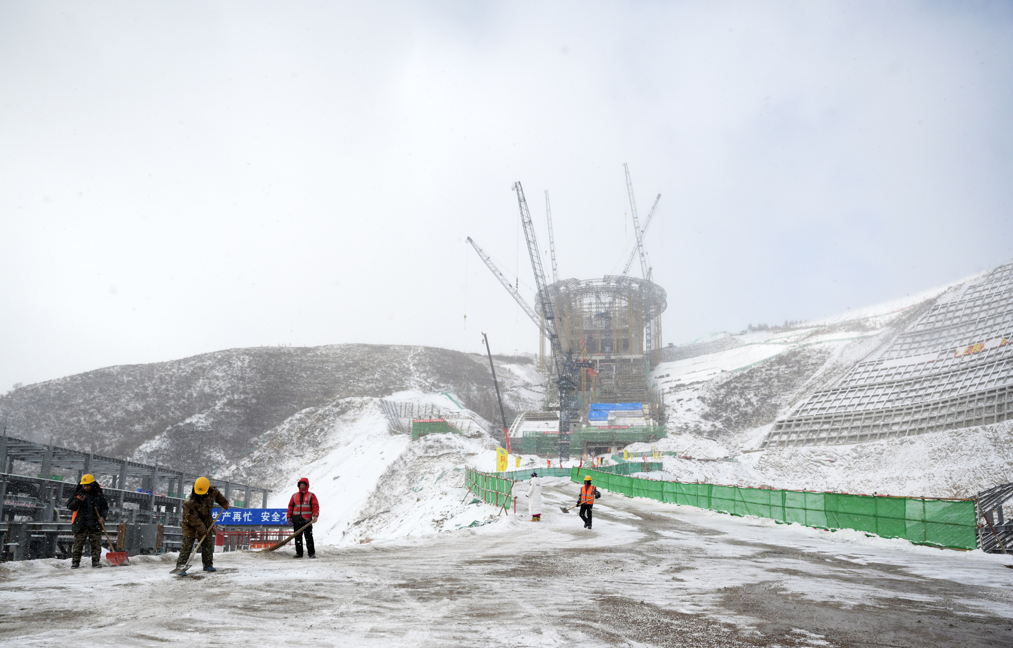 Workers sweep snow at the venue for ski jumping competition at the 2022 Beijing Winter Olympic Games in Chongli, north China's Hebei Province, Dec. 10, 2019. (Xinhua/Bi Mingming)
