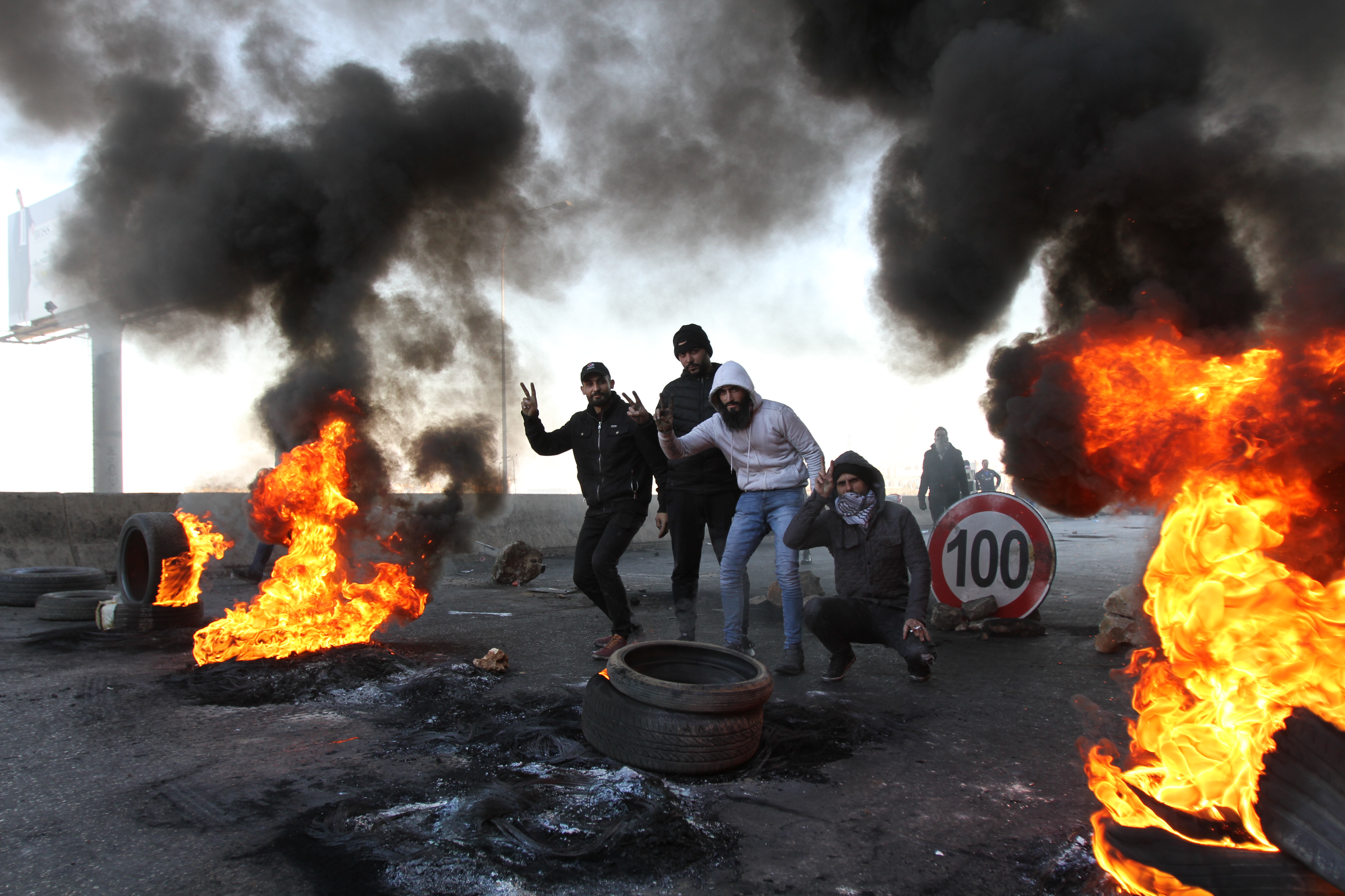 Protesters burn tyres to block the road in Lebanon's northern city Tripoli on Dec. 20, 2019. Protesters in Tripoli blocked roads on Friday to protest against the appointment of Hassan Diab as the new prime minister. (Photo by Khalid/Xinhua)