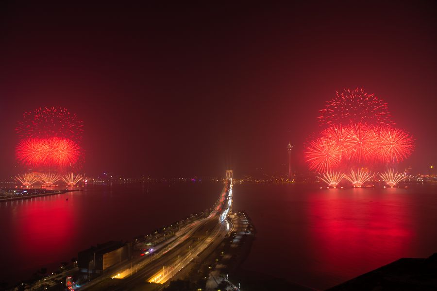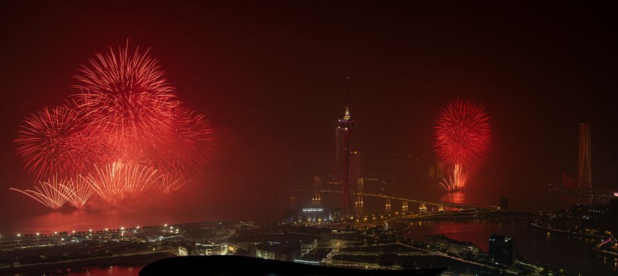 The 30-minute firework show was composed of four chapters. About 160 thousand fireworks were launched from both sides of Macao's Sai Van Bridge, bursting and lighting up the sky over the two cities.
