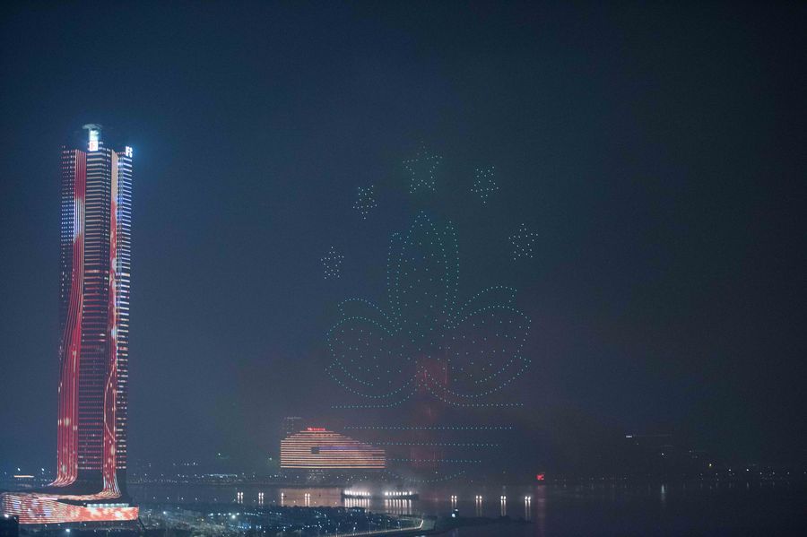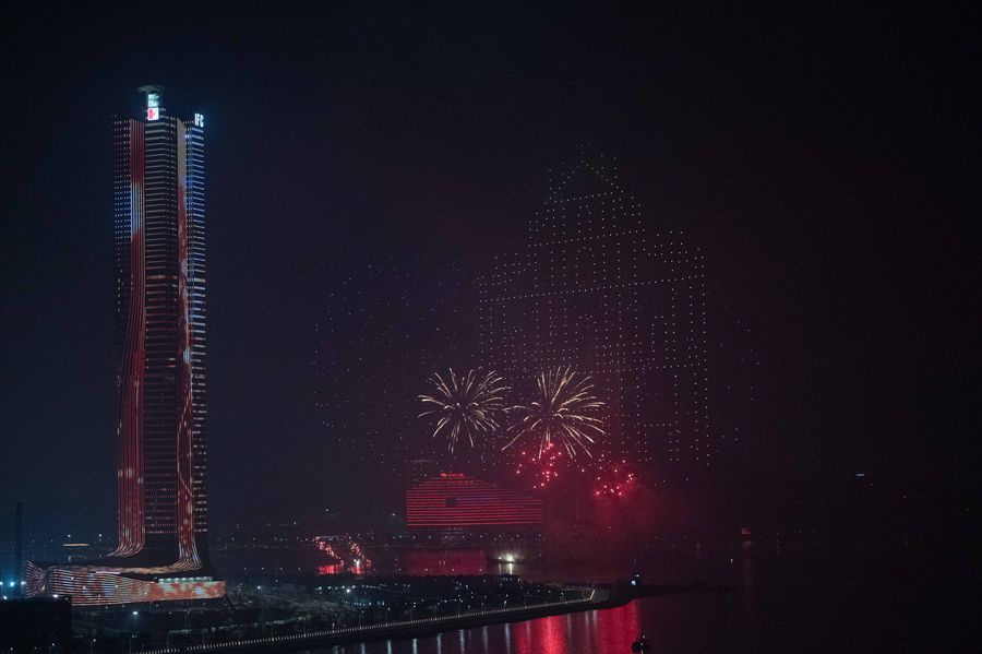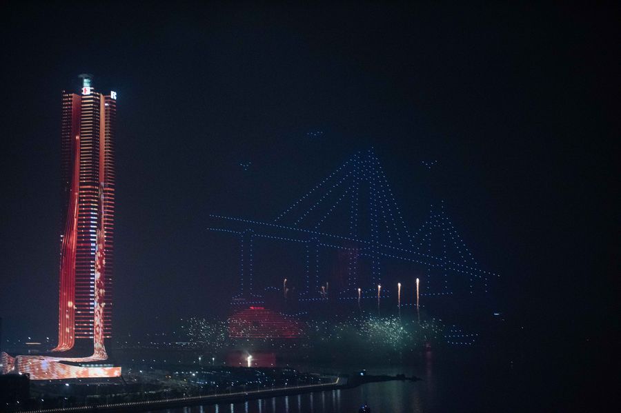 The show began with the firework spelling out "20", symbolizing the 20th anniversary of Macao's return to the motherland. During the show, 600 drones flew up to the sky, forming characters like "20" and "Macao and Zhuhai are family" as well as images of the Ruins of St. Paul's complex, one of Macao's best-known landmarks, and the marvelous Hong Kong-Zhuhai-Macao Bridge.