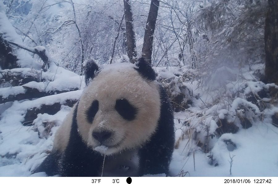 Photo taken on Jan. 6, 2018 by an infrared camera shows a wild giant panda in Baishuijiang National Nature Reserve in northwest China's Gansu Province. (Xinhua/Baishuijiang National Nature Reserve)